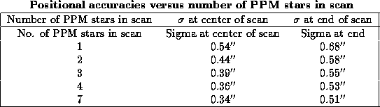 The position errors, using the PPM stars to determine only a single offset for each scan, are of course at a minimum at the center of each scan and highest at the end of each scan, varying quadratically from the center. (This is because the ends of the scan are on average farther from the PPM stars.)