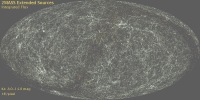 Extended sources range in size from 10´´ to nearly 2° in diameter (e.g., M31). Most 2MASS XSC galaxies are small, settling near the resolution limit of 2MASS. The distributions for extended sources of the isophotal and total radii are shown in Figure 9 (galaxies) and Figure 10 (Galactic sources).
