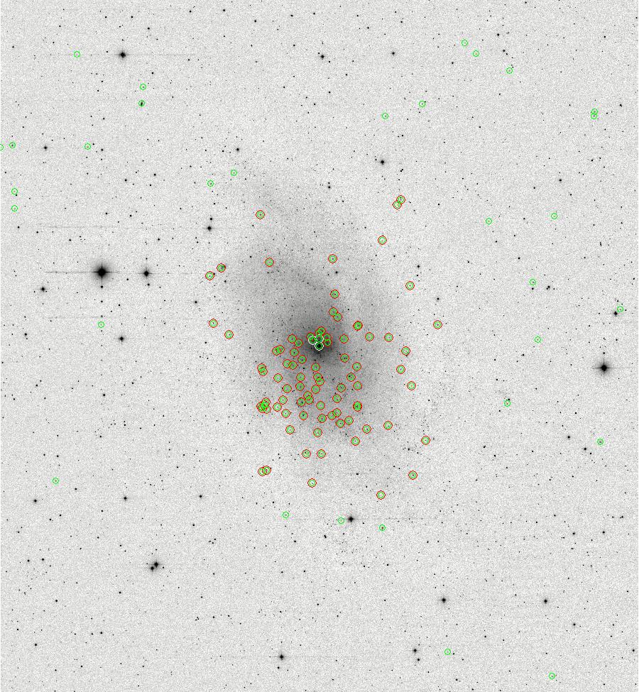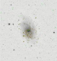 White marked sources near the nucleus represent sources identified with the parent itself (M33 in this instance). These sources are purged from the XSC (since they are replaced by the LGA parent source). Notice that the extended sources (red marked) are in fact pieces of the M33 spiral arms. Also notice that the distribution is asymmetric from north to south (many more sources detected in the south). The asymmetry arises from that fact that the m33 nucleus was nearly cut in half by a coadd boundary (with the "southern" coadd having the nucleus), so the background removal in the 2MASS pipeline (GALWORKS) was, likewise, non-uniform -- each coadd had a separate solution for the background.