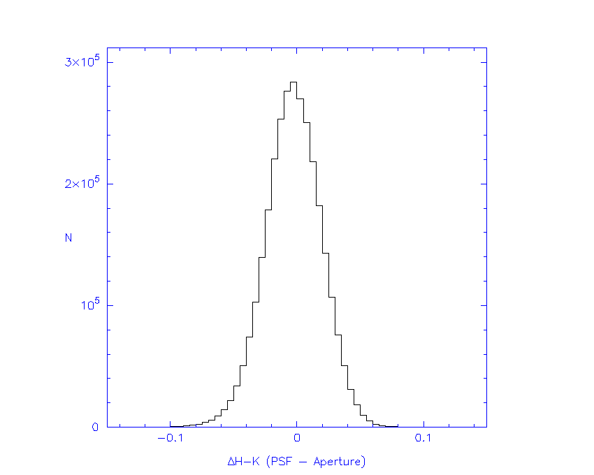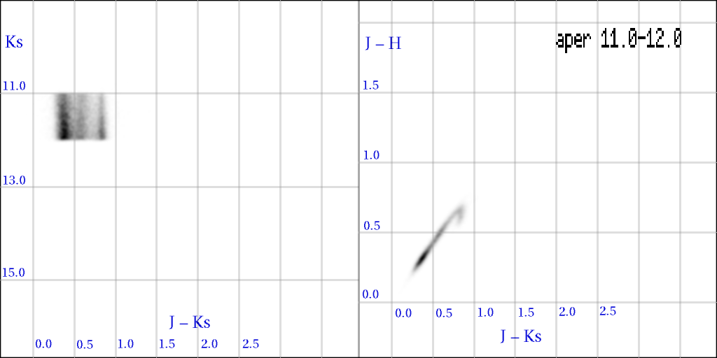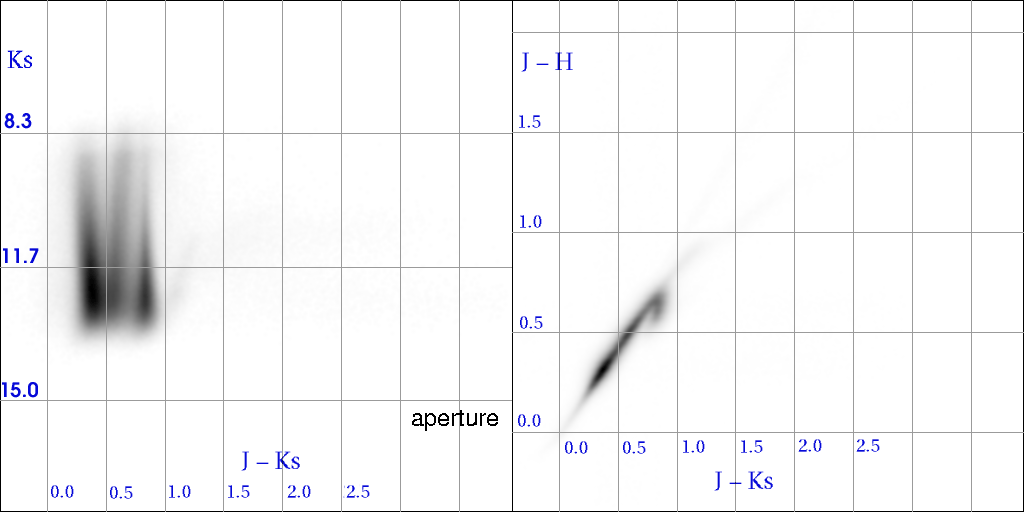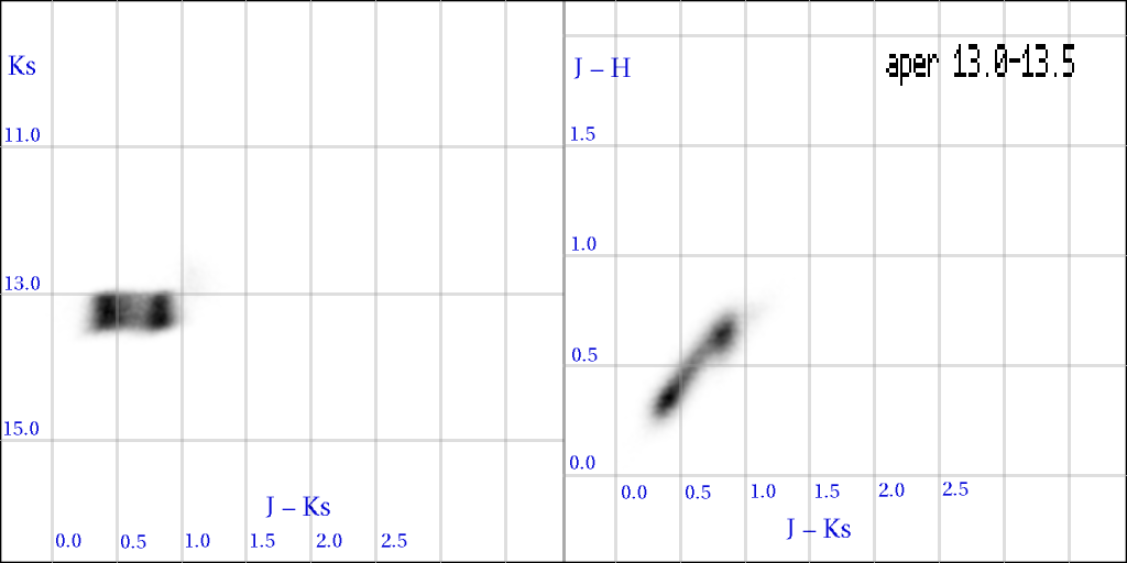 Aperture photometry provides the ultimate photometric precision for bright sources ([jhk]_m_aper < 13.0), since it does not depend on the perfect matching of a source's spatial profile with a pre-determined PSF. At faint magnitudes ([jhk]_m > 13.0), however, the reduced spatial footprint of a PSF profile fit yields a superior flux relative to an aperture measurement (which necessarily incorporates a large background area). Figure 38 presents aperture photometry for bright stars. The color-color relationship is more sharply defined, compared with Figure 37. Figures 39 and 40 make direct comparisons between aperture and profile-fit results in two narrow magnitude ranges. For 11.0<Ks(mag)<12.0, aperture photometry is superior to profile-fit photometry. For 13.0<Ks(mag)<13.5, the reverse is true.