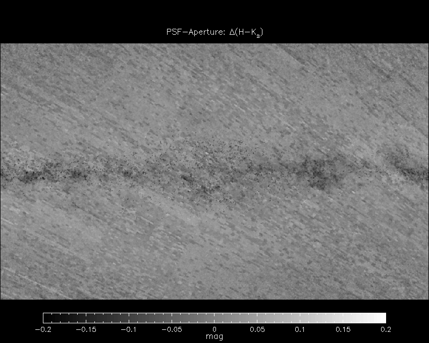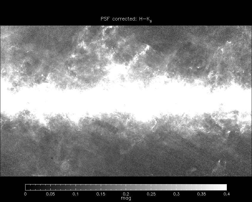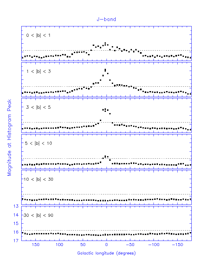 The above impressions where quantified by computing, for each 10 × 10 arcmin2 pixel in the star count maps, the magnitude bin which contains the peak star counts. The magnitude at the peak star counts was taken as a measure of the completeness. Note that this definition of completeness differs from that used to characterize the 2MASS Point Source Catalog, which was defined to be the faintest magnitude bin which recovers 99% of the expected source counts and was measured based on repeated observations of 2MASS calibration fields and overlap regions in the 2MASS survey. The definition of completeness used here is not as stringent.