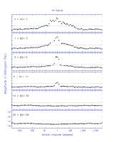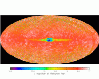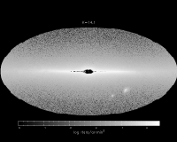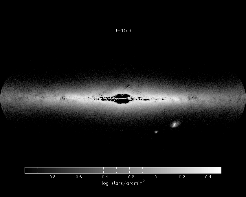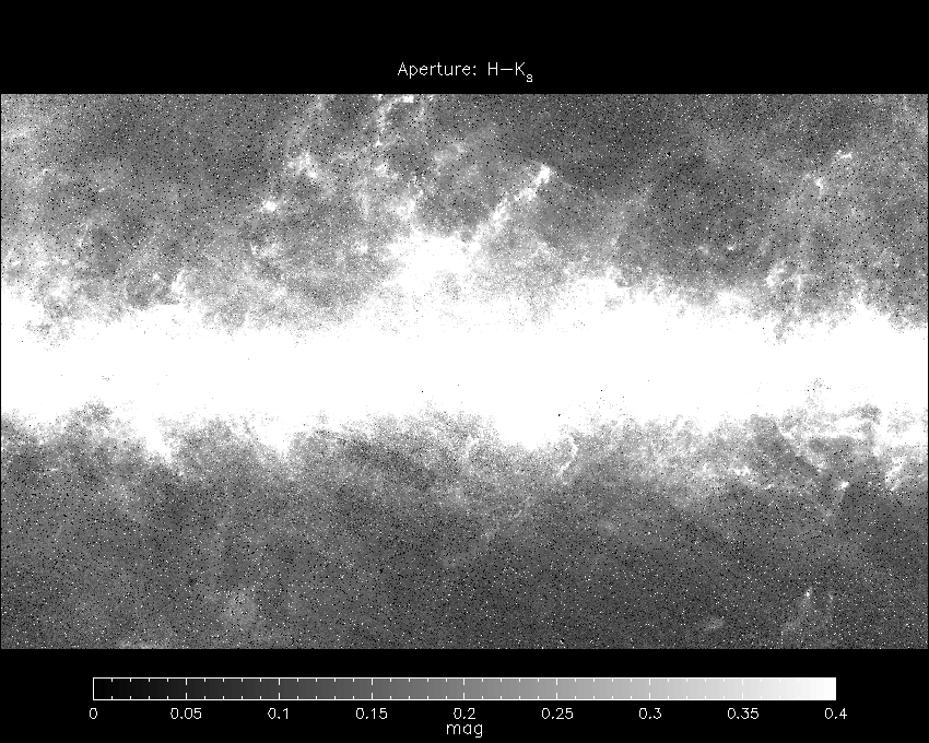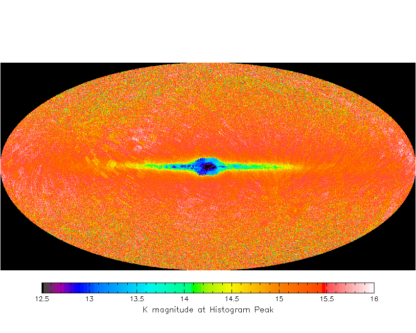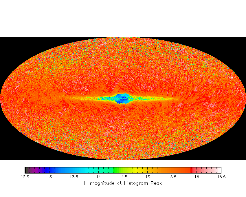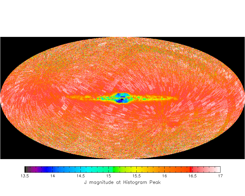 A simple, yet powerful, visual representation of the 2MASS completeness limit over the entire sky can be obtained by viewing the "movies" in Figures 15, 16, and 17. These movies cycle through images of the differential star counts, in 0.2 mag bins, presented in the Galactic Aitoff projection. The Galactic Plane is clearly visible in these movies as the bright horizontal band. The star count maps show a patchy distribution in the Galactic Plane, especially at J, due to extinction from dust within the Galaxy. Beginning at approximately J=14, H=13.5, and Ks=13 mag, the star count maps start developing holes (as represented by the black regions), first near the Galactic center, and expanding to larger galactic latitudes for fainter magnitudes. These holes are a result of confusion noise.