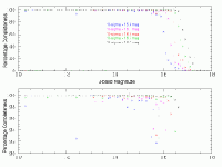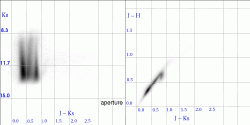 Bright stars are absent in the color-magnitude diagram of stars with [jhk]_m_stdap aperture magnitudes in the PSC database (Figure 38). This column was populated with an aperture magnitude only if the source had a valid profile-fit detection (and thus only if the star did not saturate the 1.3 s exposure). Aperture photometry was used exclusively to produce rd_flg=1 photometry extracted from the 51 ms "Read_1" exposure; however, this value becomes the default magnitude, [jhk]_m, for the source and does not appear in the ( [jhk]_m_stdap) column. The [jhk]_m_stdap column is null for rd_flg=1 detections.