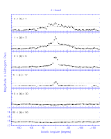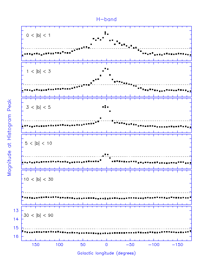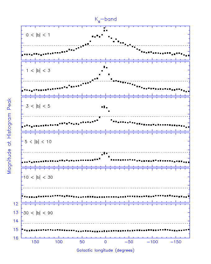 Figures 18, 19, and 20 show images of the derived completeness limits in the Galactic Aitoff projection for the J, H, and Ks bands. Further, Figures 21, 22, and 23 show the average completeness limit, as a function of galactic longitude, for several latitude bins. Relative to the average completeness at high galactic latitude (|b|> 30°), incompleteness in the Galactic Plane occurs within approximately (a) 80° of the Galactic Center for |b| < 3°, and (b) 6° of the Galactic Center.