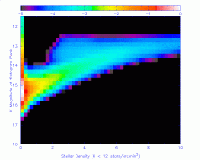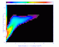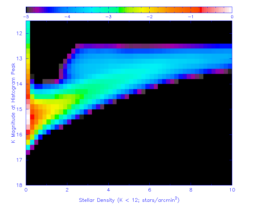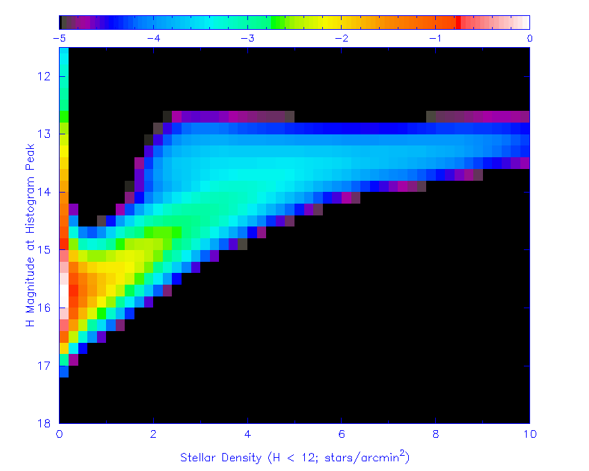 In addition to the Galactic Plane, the completeness limit will occur at bright magnitudes in high density regions, such as the Large Magellanic Cloud and globular clusters. For these regions, it is instructive to view the completeness limit as a function of source density. Figures 24, 25, and 26 show magnitude of the peak star count bin as a function of source density. The source density has been computed for sources brighter than magnitude=12, since Figures 18--23 indicate that nearly the entire sky is complete to that magnitude limit. The color scales in Figures 24, 25, and 26 are normalized such that peak value is unity. These figures show that at low stellar densities (i.e., high galactic latitudes), the magnitude histograms peak at approximately J=16.5, H=15.7, and Ks=15.2 mag. As the stellar density increases, the magnitude histograms systematically peak at brighter magnitudes.