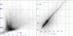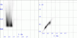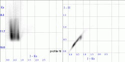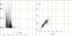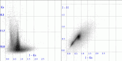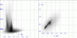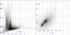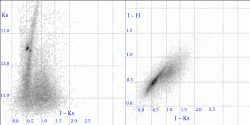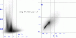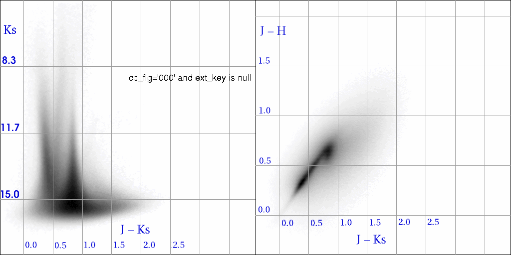 The diagonal features at faint magnitudes in the previous example arise from the use of upper limits calculated at the positions of non-detections. Sources must be detected in all three bands (and thus have a rd_flg value of 1, 2 or 3, in each rd_flg position) for valid color-color analysis. In addition, they must have valid photometric quality. All positions in the ph_qual flag must contain an "A", "B", "C", or "D". This condition is obtained by selecting against the other possible values of ph_qual that indicate non-existant or corrupted photometry ("E", "F", "U", and "X") The ph_qual restriction naturally delivers sources with valid rd_flg values. Figure 29, which includes only sources with valid three-band detections, is dominated entirely by astrophysical features convolved with the Survey's noise characteristics. The vertical spikes in the color-magnitude diagram are common dwarfs (left) and giants (right) smeared in apparent magnitude by their varying distance. The spikes are "sharp" at the bright end and broaden toward faint magnitudes, due to increasing flux uncertainty. In the color-color diagram the sources largely cluster along the coincident giant and main-sequence track for stars of earlier spectral type than K5. The "hook" at the red end of this distribution arises from K7/M0 main-sequence stars and cooler, which now deviate from the nearly linear trend (giants continue along the linear sequence as shown in Figure 30). The sources redder than J-Ks=1.0 mag at faint magnitudes are largely unresolved galaxies.