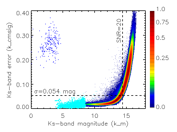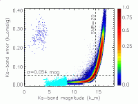 Since detection above SNR>7 in any one band or SNR>5 in two bands is sufficient to include all three bands of source extractions in the Release database, many sources may have exceptionally large flux uncertainties in some bands. The previous figures included sources with relatively low signal to noise ratio and, thus, large photometric uncertainty. A variety of means exists to select samples of sources with small photometric uncertainty. A very simple approach involves using the "photometric quality" flag -- ph_qual. This three-character (one for each band) flag is set to "A" in a given band when the photometric uncertainty for the source extraction is <0.109 mag and the source flux to sky noise ratio exceeds 10. Selecting sources with ph_qual="AAA" ensures modest uncertainty in all three bands (Figure 35). Most apparent in these figures is the absence of the wide pedestals in the color-magnitude diagram. Since SNR=10 is typically achieved at Ks~14.5 mag, fainter sources do not survive the ph_qual="AAA" restriction.