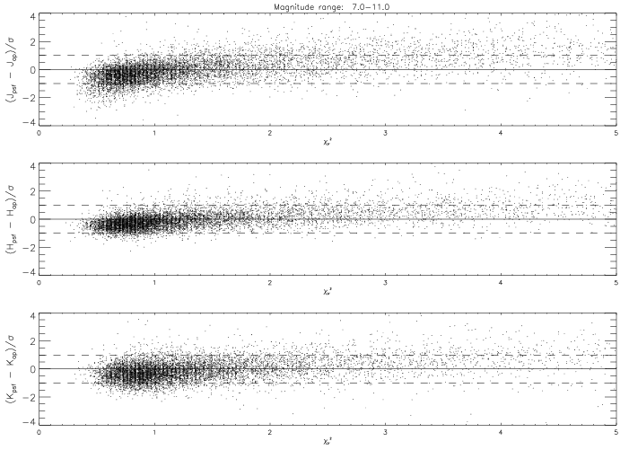 Repeated observations of sources provided empirical uncertainties, as a function of magnitude, as a means of validating the statistical uncertainties assigned to individual source by the extraction algorithms. The quoted default uncertainties are consistent with the repeatability statistics. Figure 3 illustrates the locus of quoted default uncertainty ([jhk]_cmsig) for Ks-band sources across the entire dynamic range of 2MASS. At faint magnitudes (Ks>13 mag) uncertainties rise, due to the dominance of background noise. For 8.5 < Ks (mag) < 13 default uncertainties are consistently in the range 0.02-0.03 mag. This limiting profile-fit uncertainty is attributable to undersampling, due to the coarse pixel size of 2MASS (2.0´´), relative to the seeing-limited image size (typically 1.0´´). Stars with 4 < Ks (mag) < 8.5 saturated in the 1.3 s duration 2MASS primary exposure. They were measured in the 51 ms "Read_1" exposure and extracted using aperture photometry receiving rd_flg=1. As a result, their mean uncertainties (light blue points) are slightly smaller than the profile-fit extractions. Stars with Ks < 4 mag saturated even in the 51 ms exposure. Their fluxes were extracted with a procedure that fit to the scattered light wings of the stellar profile. Figure 3 shows the substantially larger uncertainty associated with this procedure. The actual magnitude boundaries between these regimes vary with seeing and background conditions. Users should consult the rd_flg to track the origin of photometry for a given source. Details of the photometric extraction process and assignment of uncertainties are found in Sections IV.4.b and IV.4.c.