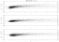 Figure 33 shows the result of an "inverse" query intended to select potentially contaminated objects. This diagram contains sources with prox < 8 and with non-zero values in the cc_flg. By and large, this "contaminated" sample resembles the "clean" sample in Figure 31, in part reflecting the conservative nature of the confusion flagging and in part indicating that flux contamination may have lesser influence on stellar colors. Given that a source is flagged as photometrically contaminated when the flux is likely biased by 0.05 mag, and given that the vertical scale in the color-magnitude diagrams spans more than 10 magnitudes, the fact that there is little obvious bias in the "contaminated" sample arises mainly from the small contamination needed to trigger the flag.