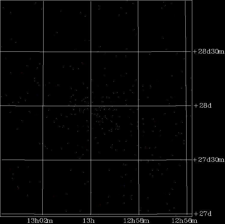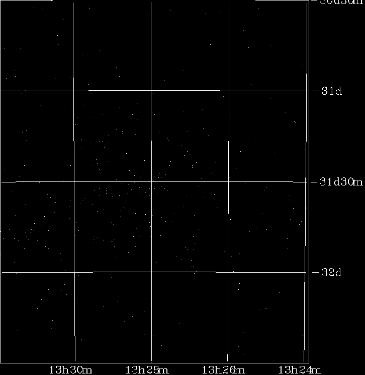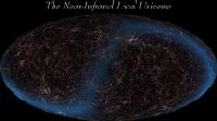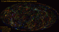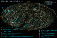 Figure 5 shows the 2.2-Micron Differentiated View of the Local Universe, Ks-band integrated flux, separated into three (RGB) mag bins: (1) Ks < 11.5 mag, (2) 11.5 < Ks < 12.75, and (3) 12.75 < Ks < 13.5 mag. The first bin represents the brightest and therefore nearest objects (e.g., Local Group), assigned to the blue (B) channel. The second bin represents the realm of the nearby superclusters (e.g., Coma cluster), assigned to the green (G) channel. The third bin represents the most distant XSC objects, filling in the Universe out to a redshift of 0.2 to 0.3, assigned to the red (R) channel. The image has been convolved with a Gaussian filter for additional smoothing (thanks to R. Hurt for this). See Figure 3 for image orientation and a map of the large scale structure.