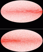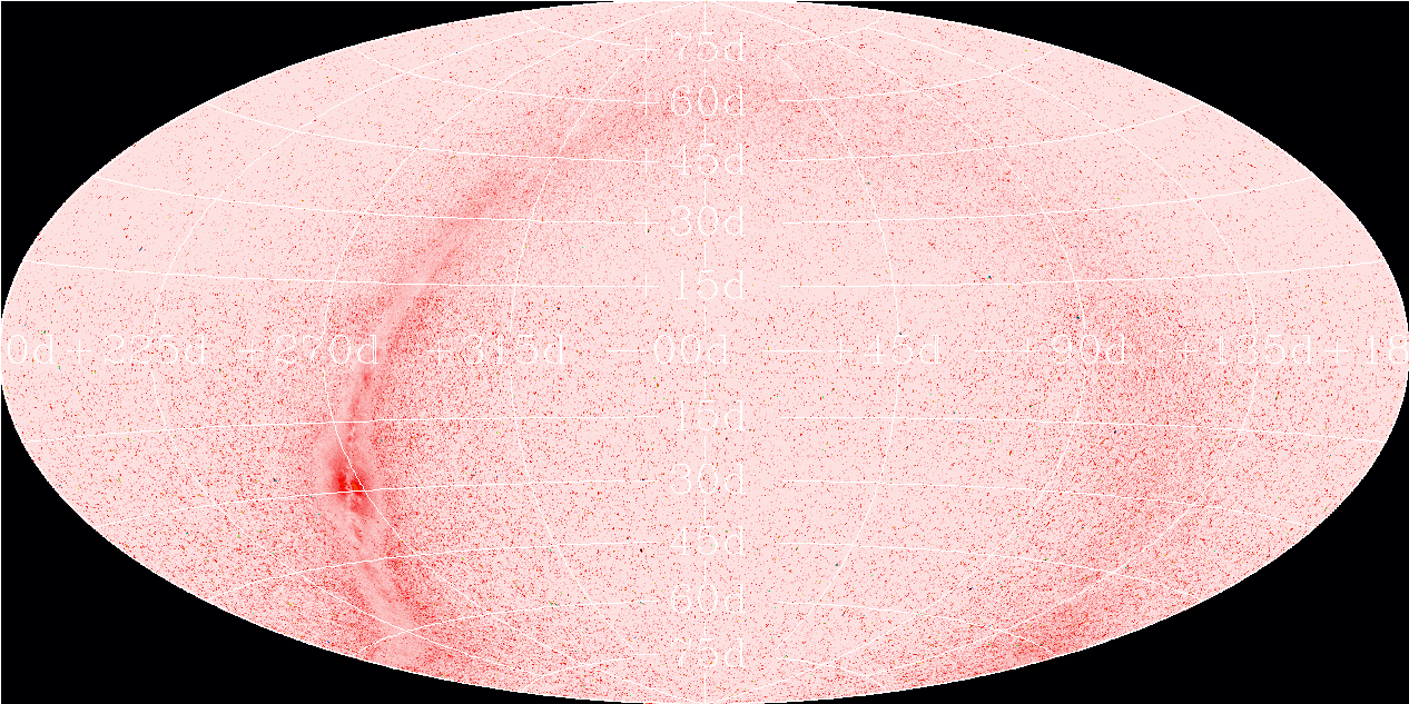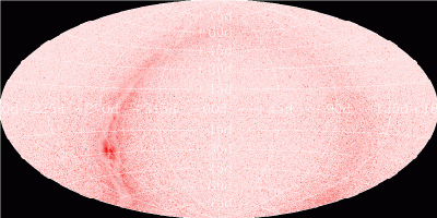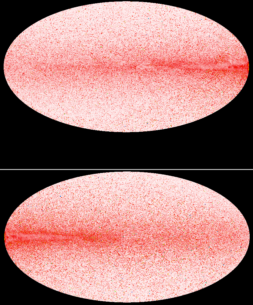 Figure 1 shows the J-band coverage with an equal-area Aitoff projection in the equatorial system. The coverage ranges from 0 to 1 (dark red to white). Figure 1 shows coverage in Aitoff Galactic projection. The top panel of the figures shows 0° < glon < 180°, and the bottom panel shows 180° < glon < 360°.