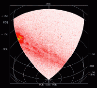 The spatial coverage of extended sources is limited by the presence of foreground stars. Bright stars block out large halo and long diffraction spike areas (see II.3d1). The coverage area is computed for each Atlas Image for each band. The typical high |glat| coverage (during the absense of very bright stars) is >98%, thus representing very good spatial coverage overall. The spatial Coverage for the southern hemisphere 2MASS scan ("044") observed 2000 April 22 is given in II.3d1, Table 1. The coordinates refer to the center of the Atlas Image, size 512´´×1024´´. The mean coverage per Atlas Image is specified by "fj" (J-band coverage), "fH" (H-band), and "fK" (Ks-band), normalized to unity.