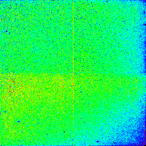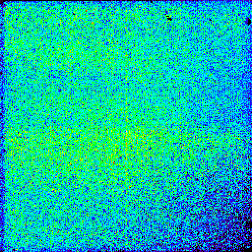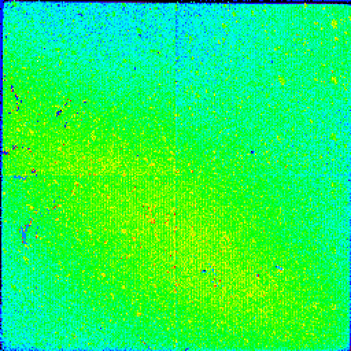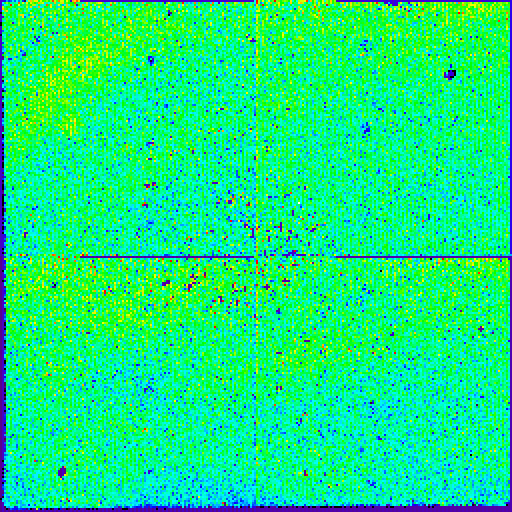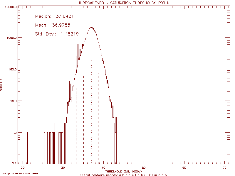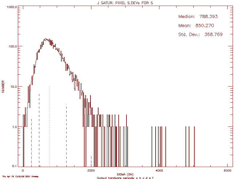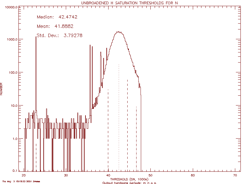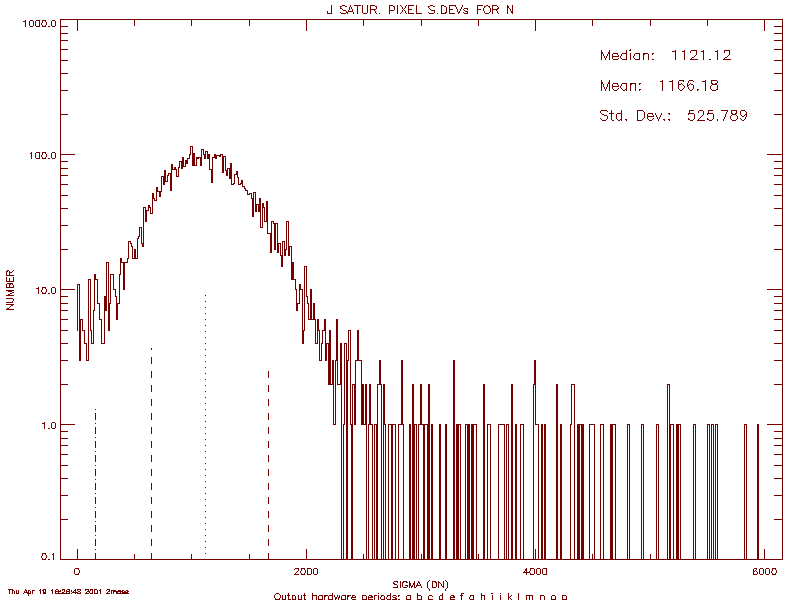 The figures below show, for each array at each observatory, (a) a histogram of the canonical saturation thresholds (i.e., before addition of the appropriate DARK for the night); (b) an image (stretch: 30K black; 45K white; blue-green-yellow-red in spectral order in between, with midpoint 37.5K green) of the canonical saturation thresholds, and (c) a histogram of the estimated pixel standard deviations.