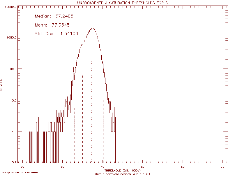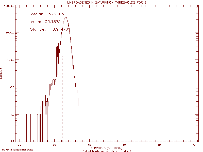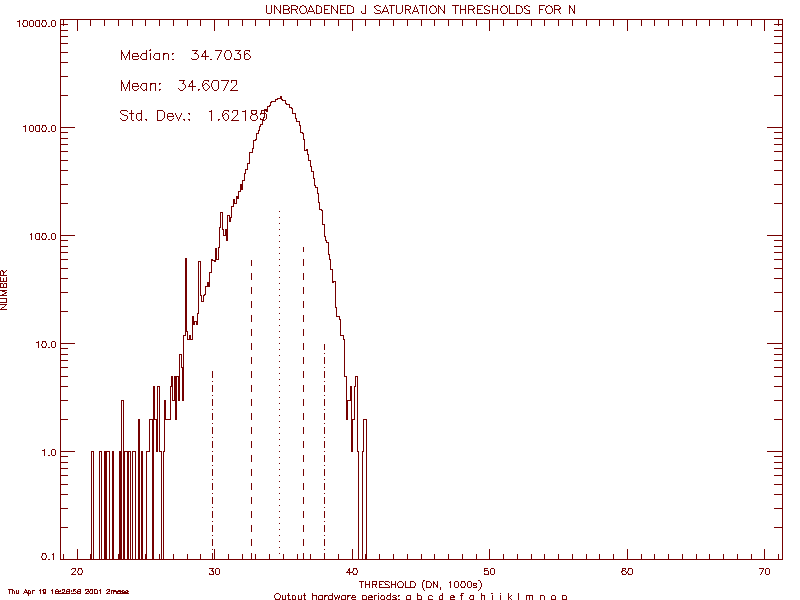 Saturation data for each array were obtained by combining several single-night estimates, first (a) subtracting the median dark for the night, then (b) combining the available thresholds for each pixel to obtain a single best estimate of the "canonical" (i.e., dark-subtracted) threshold. Finally, to obtain the best threshold estimate for each night, the appropriate nightly dark was added back into the canonical threshold. Pixels for which no good estimates are available are set to a default value, which is the 1%-tile value for all other good pixels in the same array quad, and with the same column parity (i.e., odd or even).