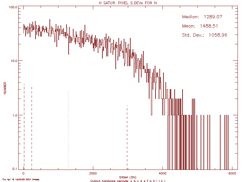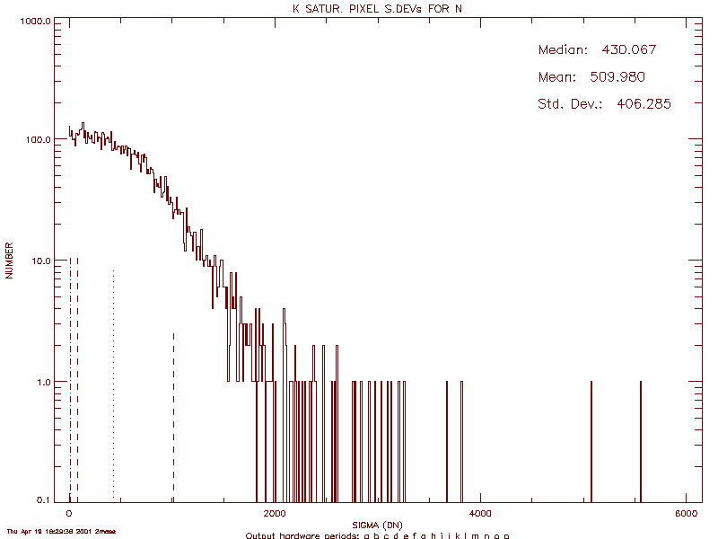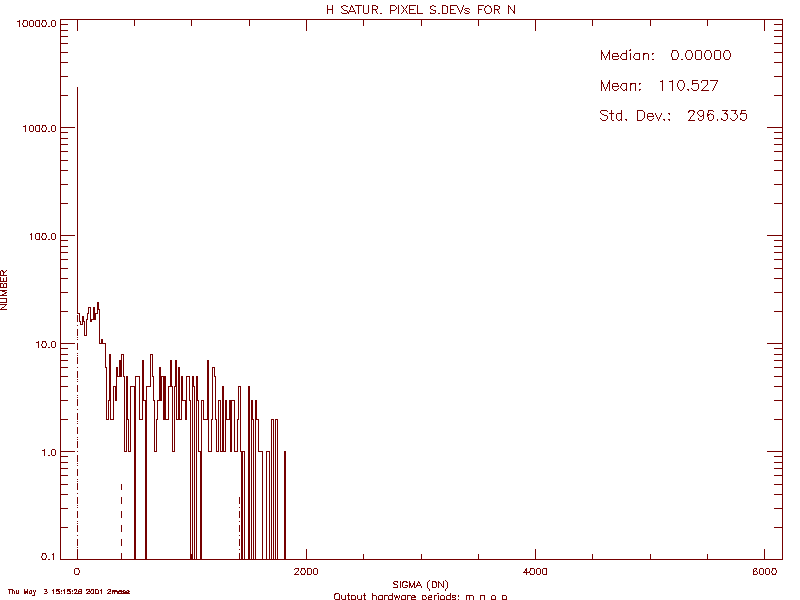 The new northern H-band array is exceptional in several respects. Because its pixel properties vary strongly across the array, it was not possible to find a set of fit intervals and accept parameters that gave more than about 60% acceptable pixels, the rest being set to the default. Instead, four fits have been made using data from one night (9/29/1999 UT), varying the parameters to optimize the analysis for different subsets of pixels. This is the meaning of the "1(4)" entry in the table. The four separate threshold maps were then combined, taking the good pixels from each. Because data from only one night was used, the Pixel Diffs and Pix.Sd.Devs are unusually low; this agreement provides some reassurance that the different analyses have not produced wildly varying incorrect results. Note however that many pixels have in fact only a single analysis run for which they passed the quality control tests. (This, incidentally, accounts for the median in the Pix.Sd.Devs plot being zero: over half the pixels had only one good sample.)