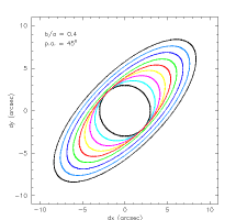 An example of a dynamically adjusted axis ratio is shown in Figure 1. The nominal axis ratio is 0.4, and the position angle is -45°. Note the increasingly circular aperture, as the radius approaches the size of the PSF.