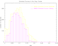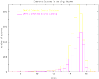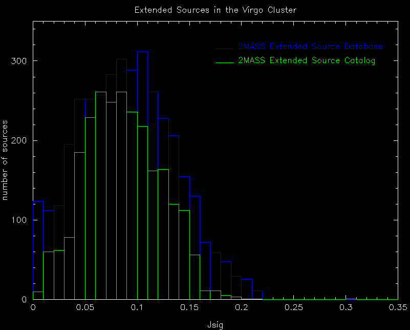 Here we present further visual inspection and analysis of the equatorial region of the entire Virgo Cluster, with 183.3° < RA < 191.1° and 10.4° < Dec < 16.4°. The working extended source database (blue line) contains 4450 sources, and the XSC (green line) contains 2532 sources. The distribution of J magnitudes is given in Figure 6, and the distribution in the photometric uncertainty at J is given in Figure 7. The difference between the database sources and the XSC distribution is due to: (1) the signal to noise ratio, (2) the degree of star-galaxy separation, and (3) the elimination of "junk" sources.