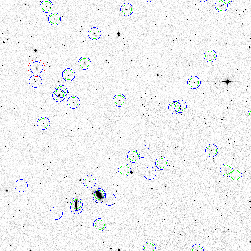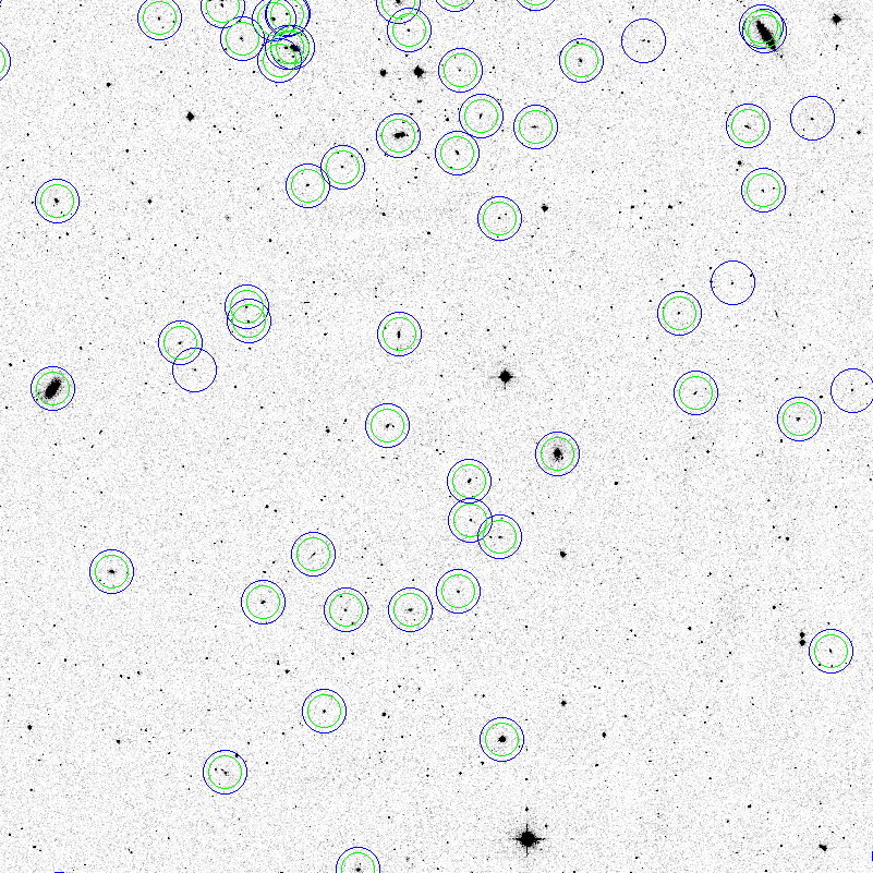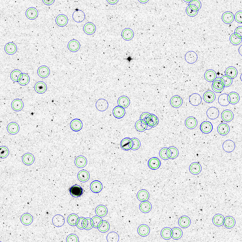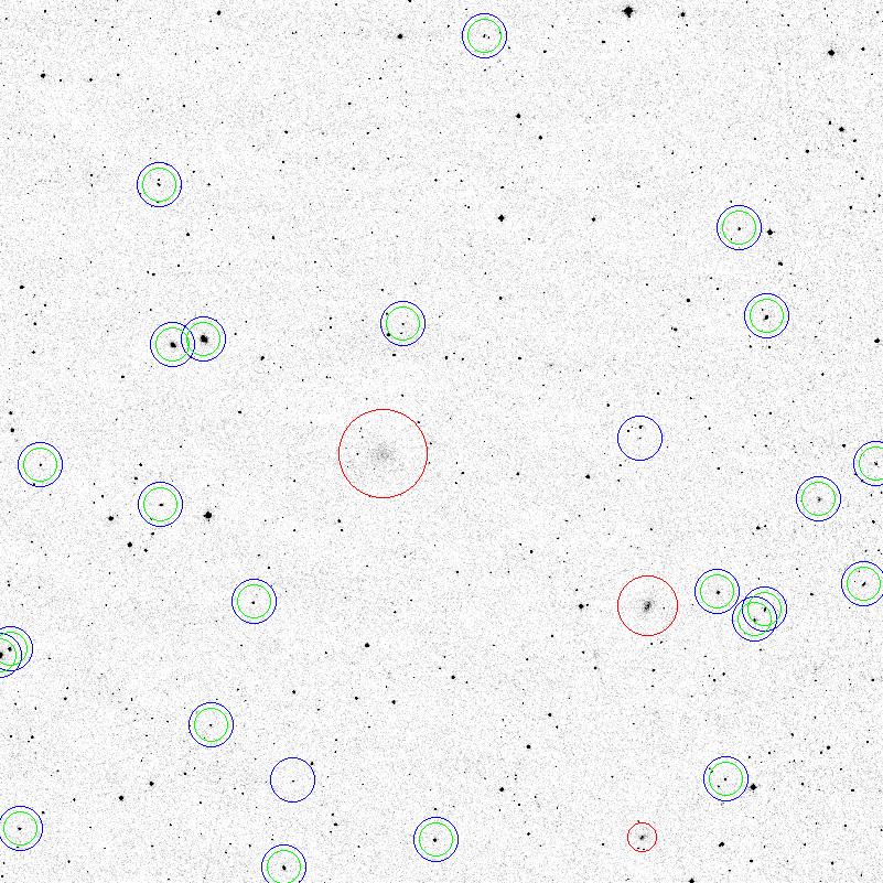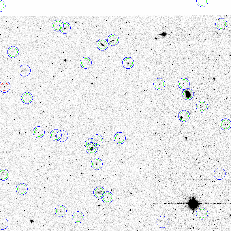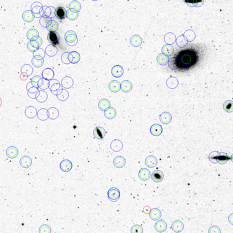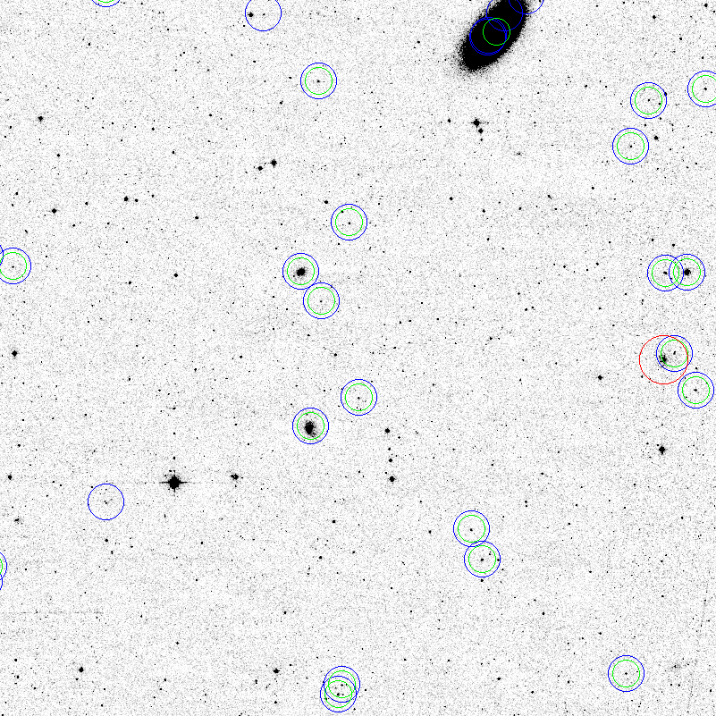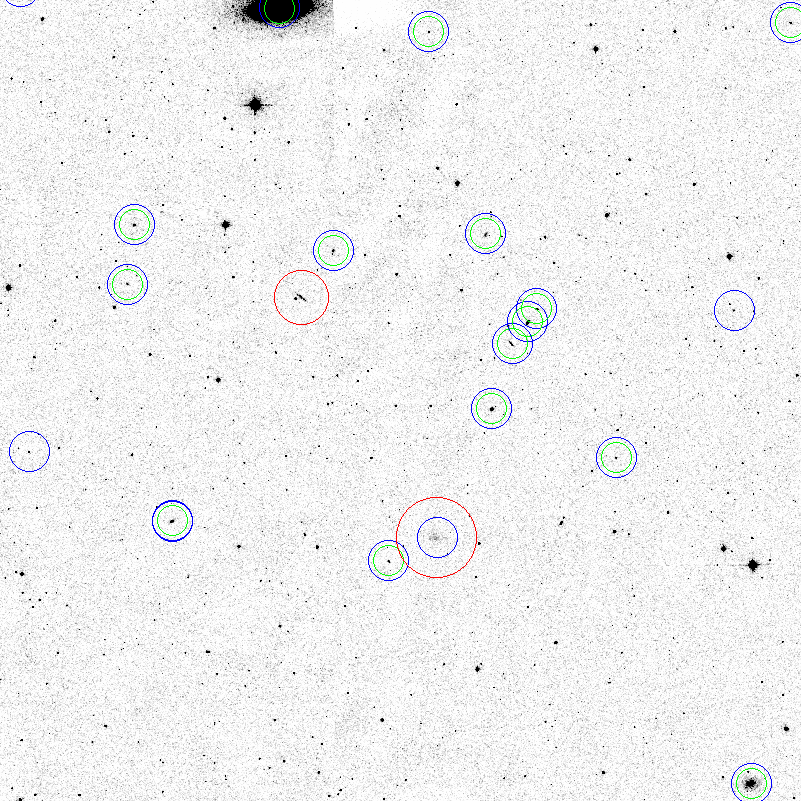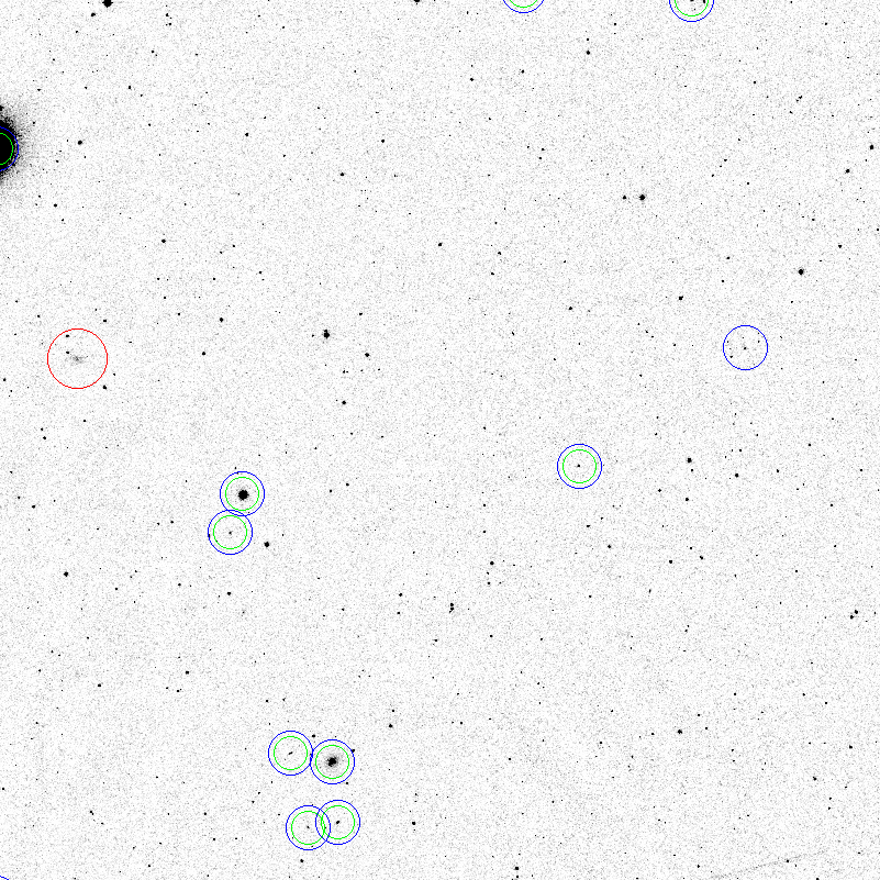 The Virgo mosaic was split into 99 pieces, each 800×800 pixels (approximately 40´ on a side). In Figures 1-99, in Table 1 below, the extended sources from the working database are indicated with blue circles, and the XSC sources are indicated with green circles. The subimages were then visually inspected, concentrating on clearly delineated Virgo galaxies which are not in the XSC (i.e., sources not circled in green). These sources (indicated with red circles) represent incompleteness in the XSC. (Items to note: "chaff" in proximity to large and bright galaxies is mostly eliminated from the XSC; artifacts from bright stars; airglow and background gradients; source confusion; faint or compact sources provide little, if any, information for this experiment.)