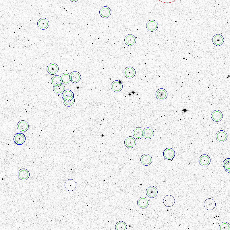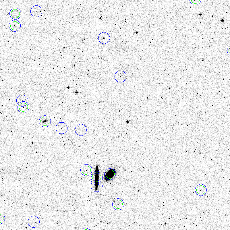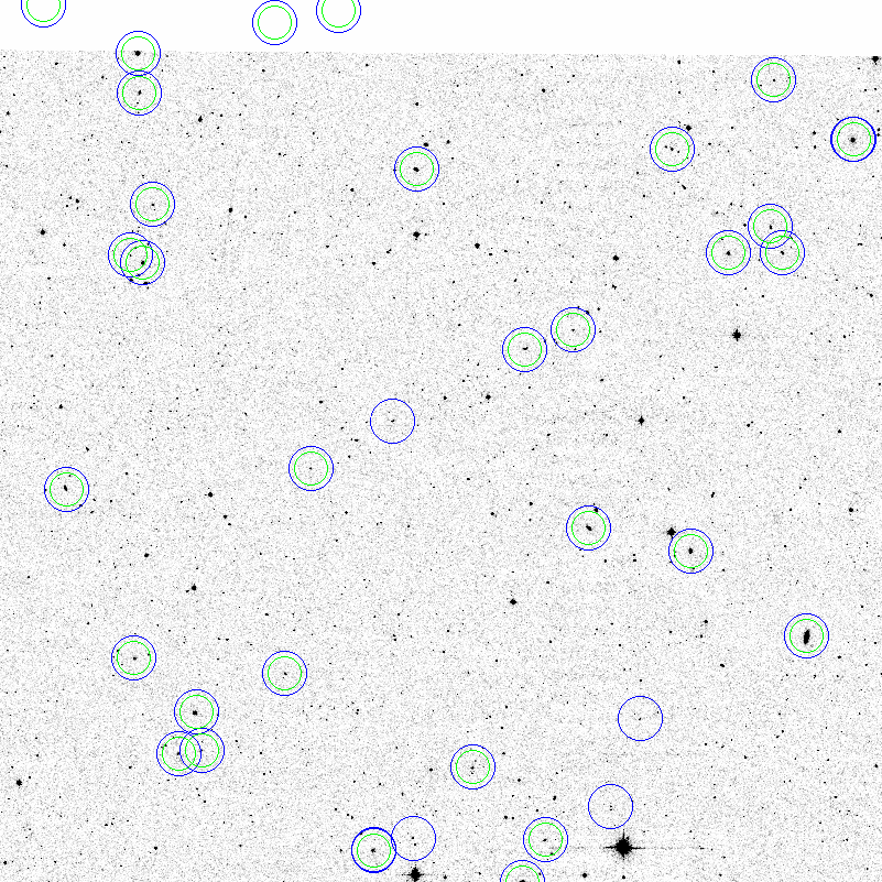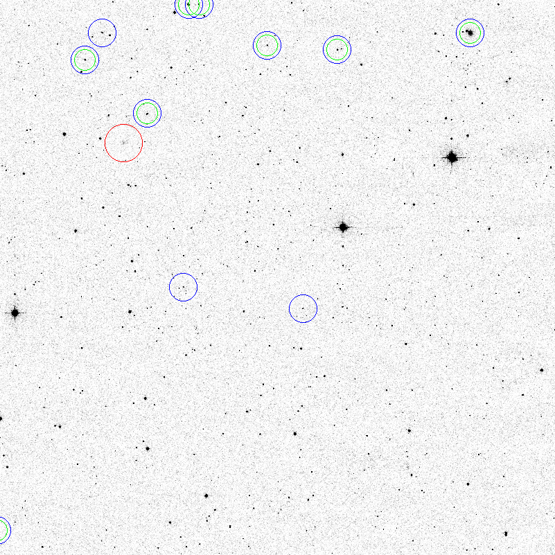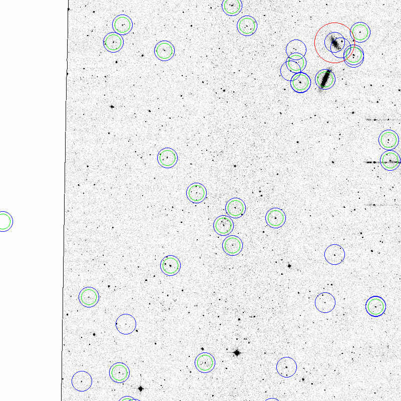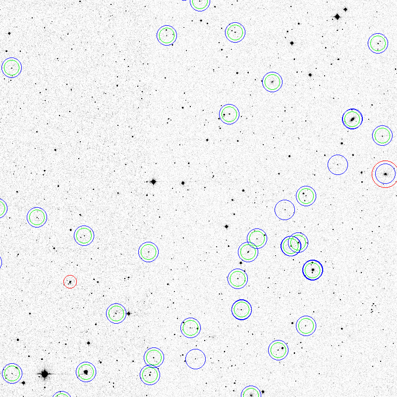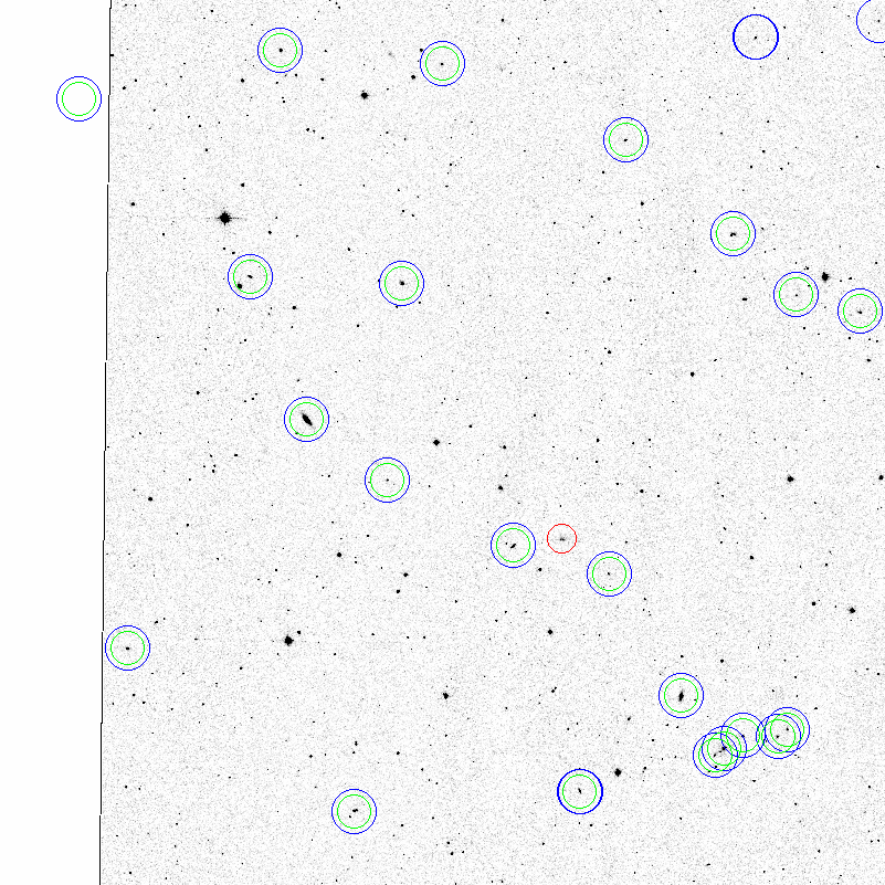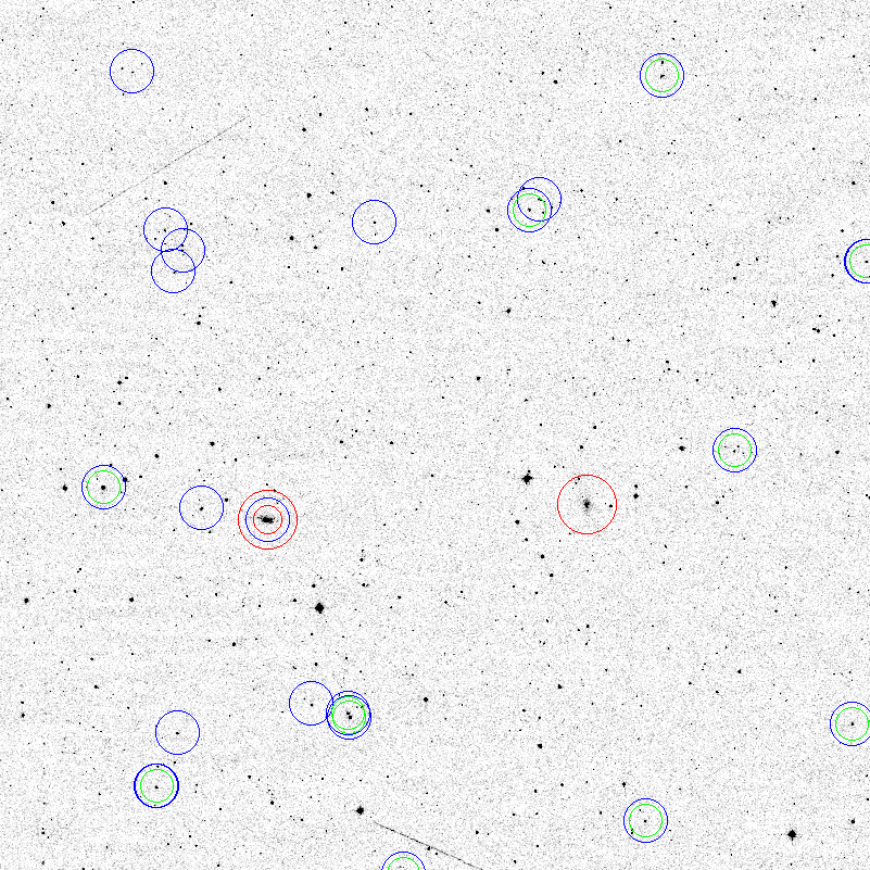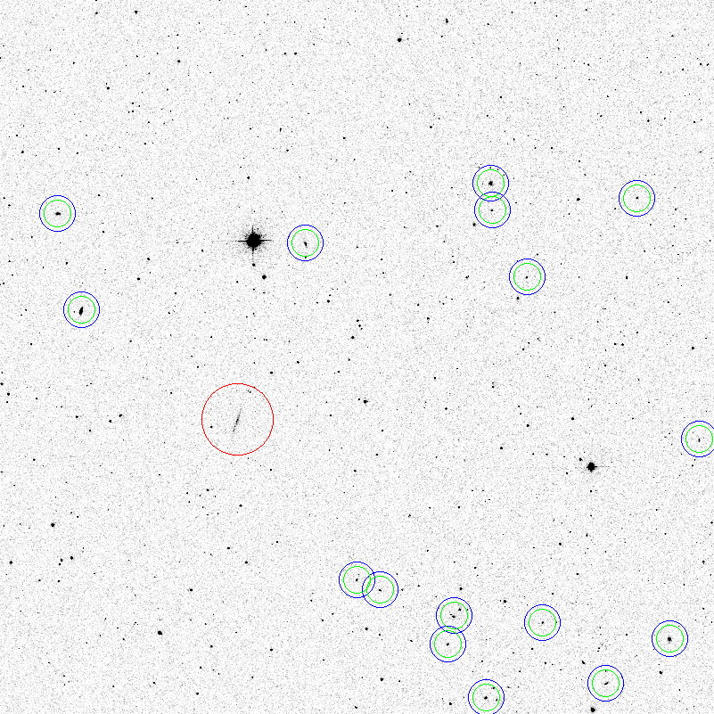 The Virgo mosaic was split into 99 pieces, each 800×800 pixels (approximately 40´ on a side). In Figures 1-99, in Table 1 below, the extended sources from the working database are indicated with blue circles, and the XSC sources are indicated with green circles. The subimages were then visually inspected, concentrating on clearly delineated Virgo galaxies which are not in the XSC (i.e., sources not circled in green). These sources (indicated with red circles) represent incompleteness in the XSC. (Items to note: "chaff" in proximity to large and bright galaxies is mostly eliminated from the XSC; artifacts from bright stars; airglow and background gradients; source confusion; faint or compact sources provide little, if any, information for this experiment.)