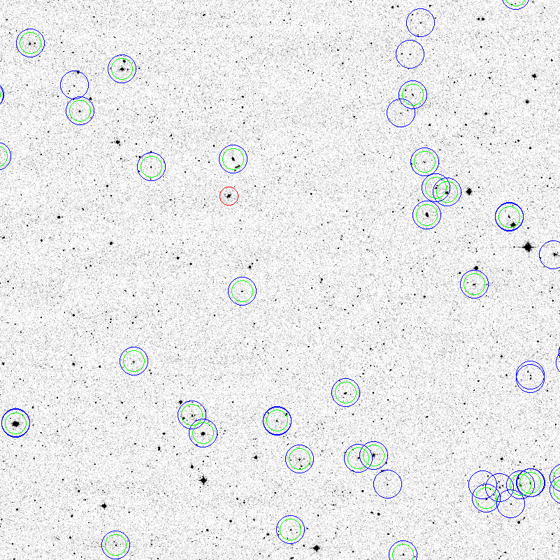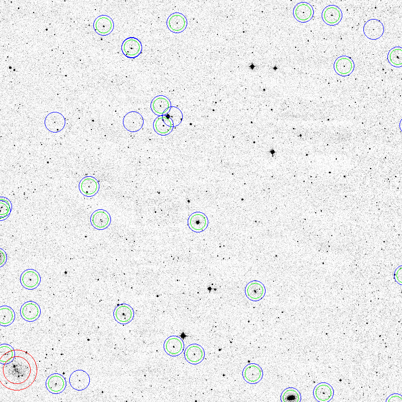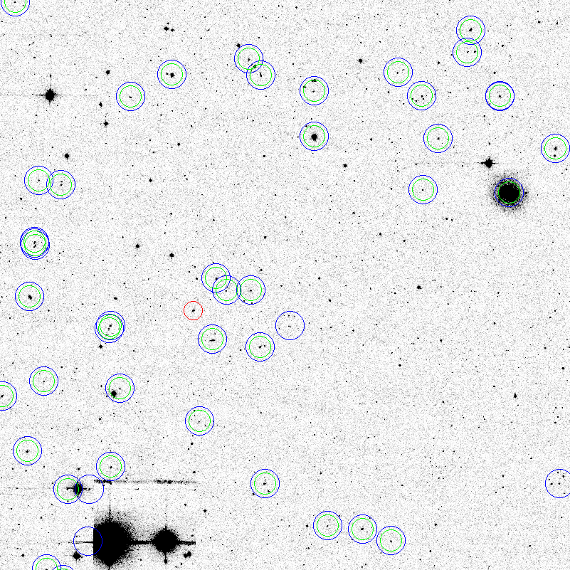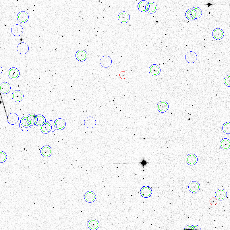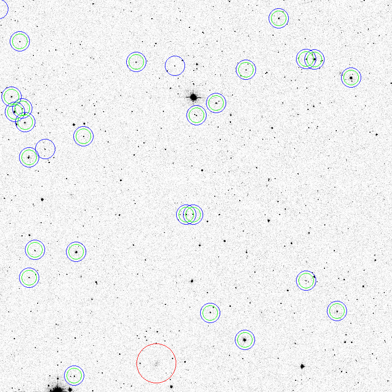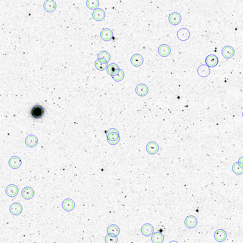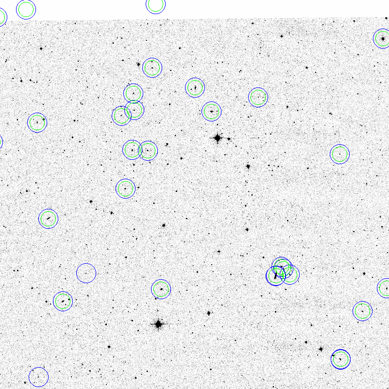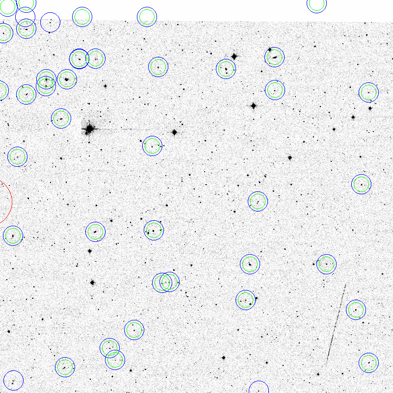 The Virgo mosaic was split into 99 pieces, each 800×800 pixels (approximately 40´ on a side). In Figures 1-99, in Table 1 below, the extended sources from the working database are indicated with blue circles, and the XSC sources are indicated with green circles. The subimages were then visually inspected, concentrating on clearly delineated Virgo galaxies which are not in the XSC (i.e., sources not circled in green). These sources (indicated with red circles) represent incompleteness in the XSC. (Items to note: "chaff" in proximity to large and bright galaxies is mostly eliminated from the XSC; artifacts from bright stars; airglow and background gradients; source confusion; faint or compact sources provide little, if any, information for this experiment.)
