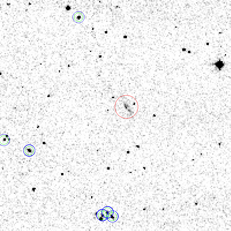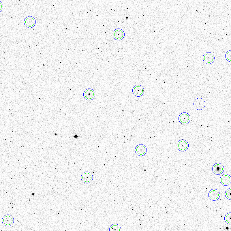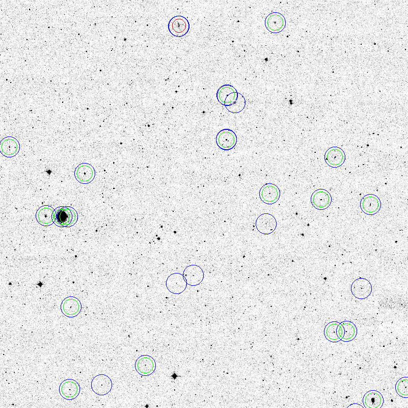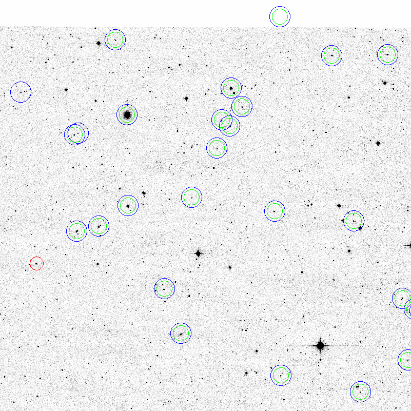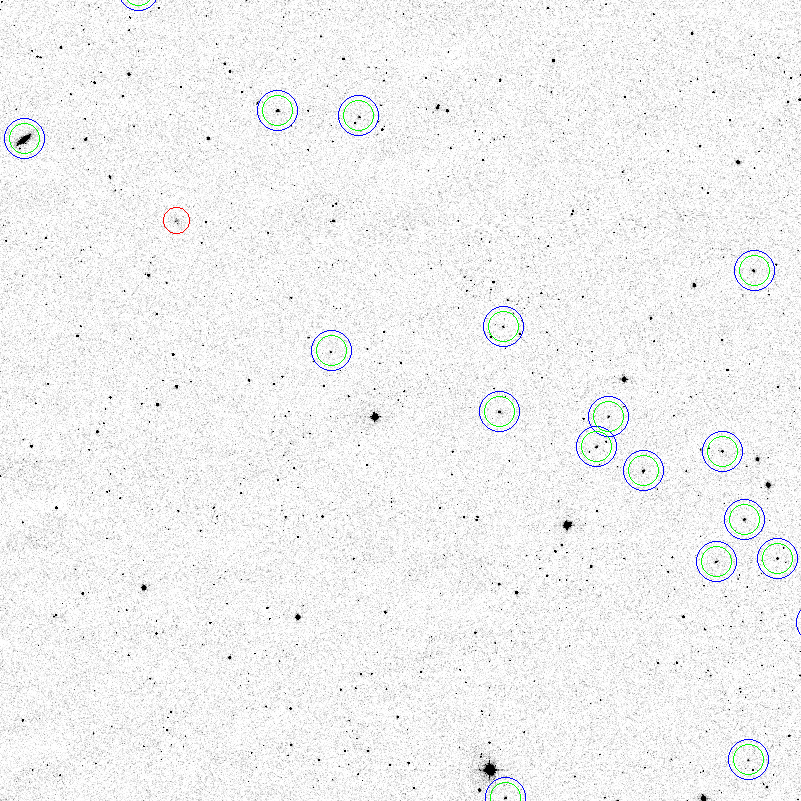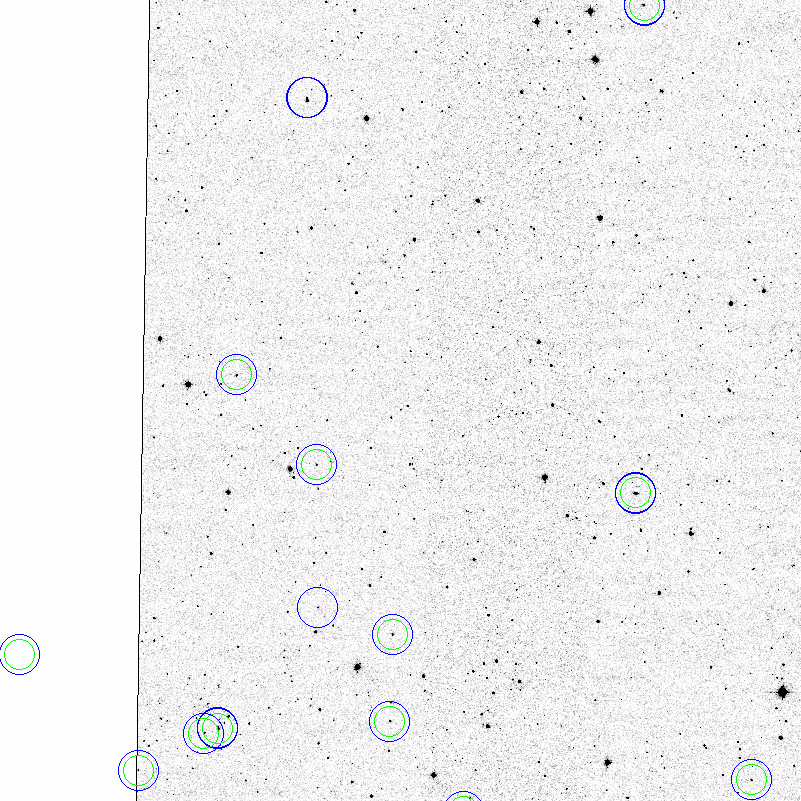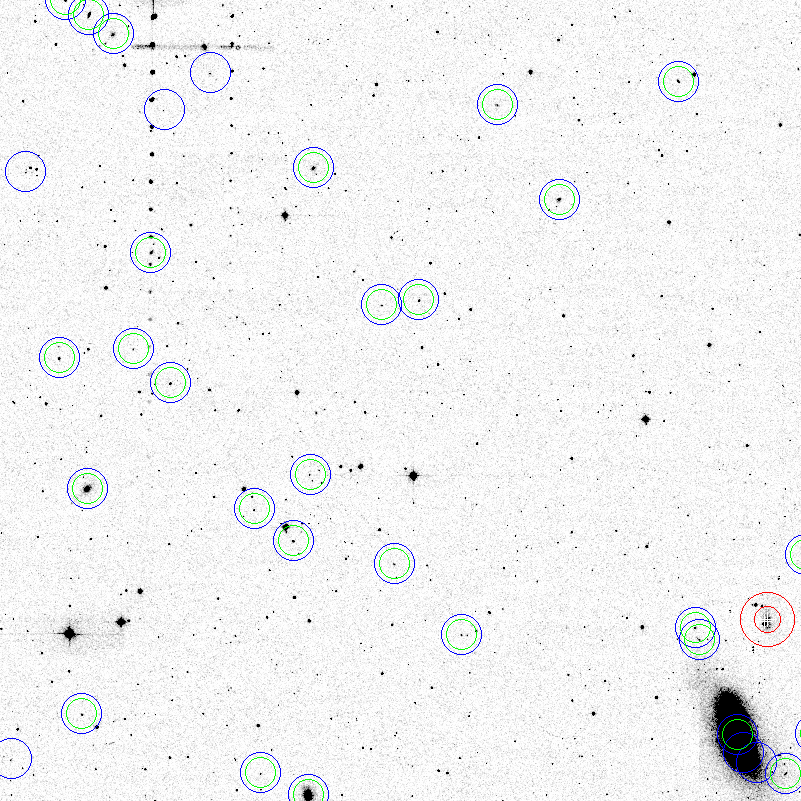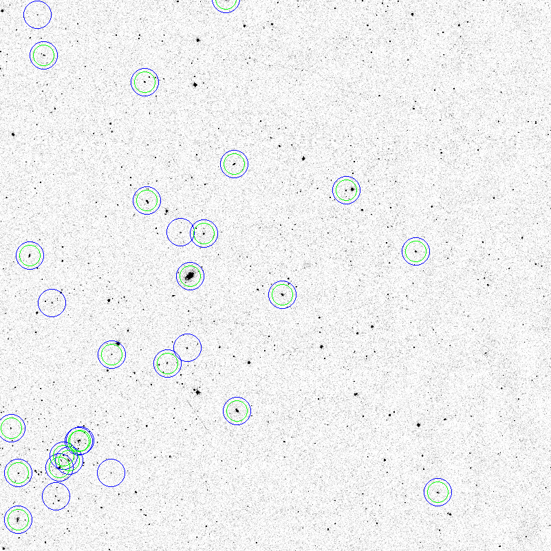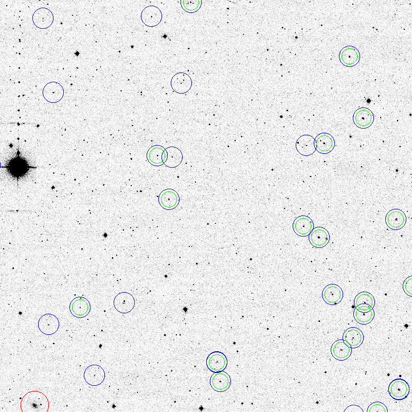 The Virgo mosaic was split into 99 pieces, each 800×800 pixels (approximately 40´ on a side). In Figures 1-99, in Table 1 below, the extended sources from the working database are indicated with blue circles, and the XSC sources are indicated with green circles. The subimages were then visually inspected, concentrating on clearly delineated Virgo galaxies which are not in the XSC (i.e., sources not circled in green). These sources (indicated with red circles) represent incompleteness in the XSC. (Items to note: "chaff" in proximity to large and bright galaxies is mostly eliminated from the XSC; artifacts from bright stars; airglow and background gradients; source confusion; faint or compact sources provide little, if any, information for this experiment.)
