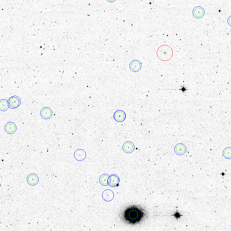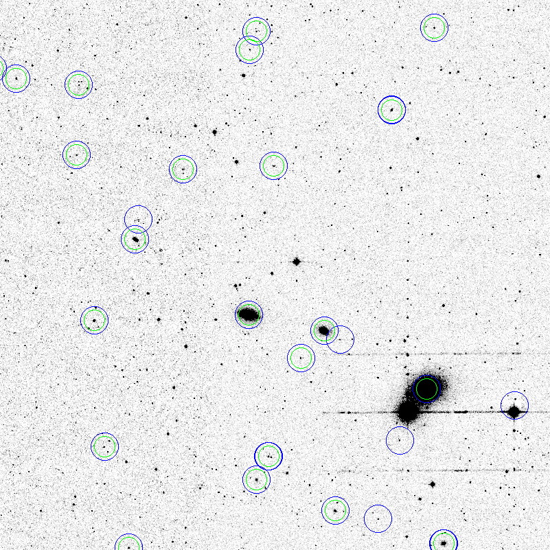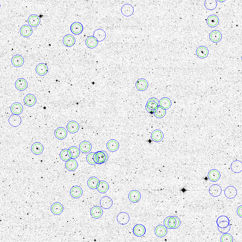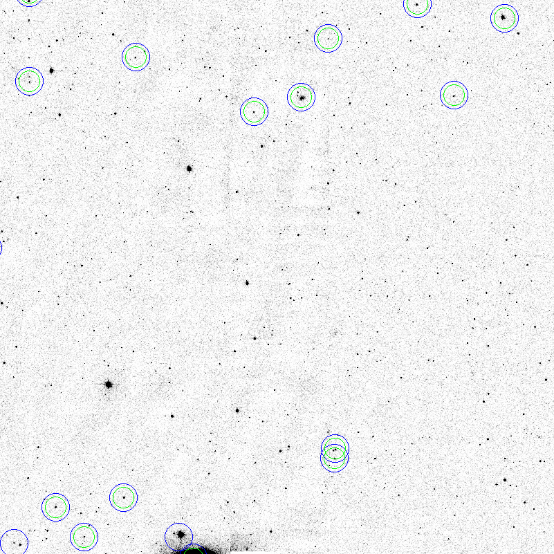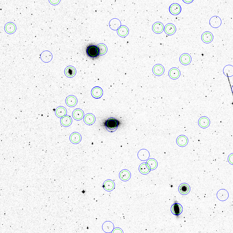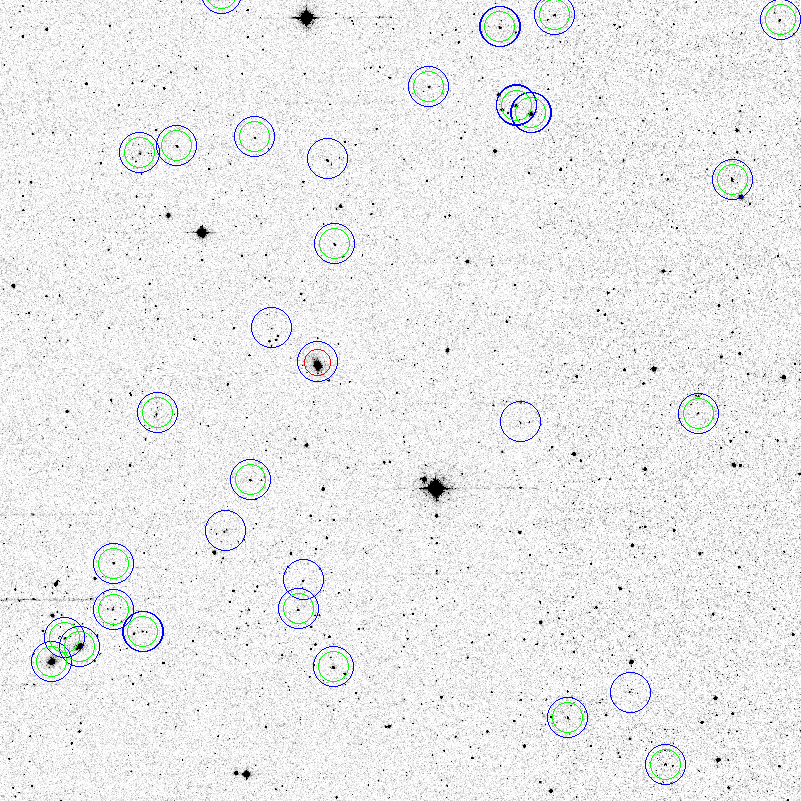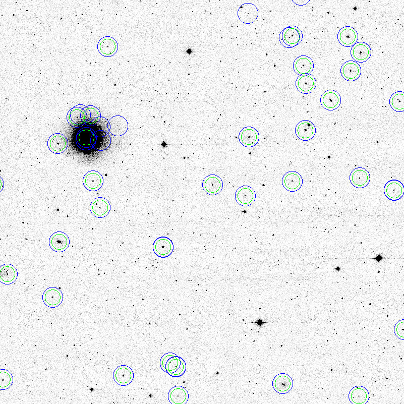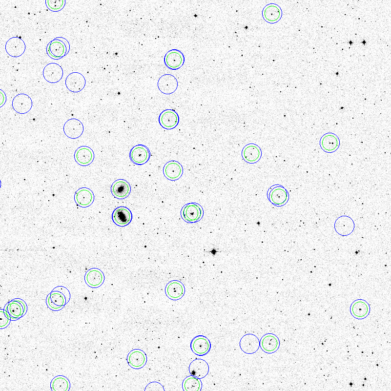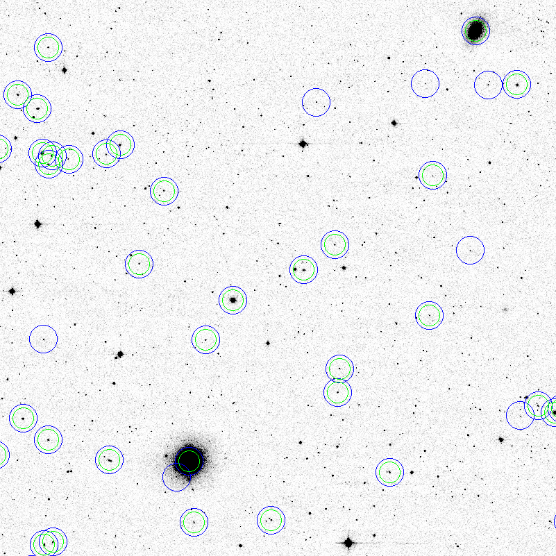 The Virgo mosaic was split into 99 pieces, each 800×800 pixels (approximately 40´ on a side). In Figures 1-99, in Table 1 below, the extended sources from the working database are indicated with blue circles, and the XSC sources are indicated with green circles. The subimages were then visually inspected, concentrating on clearly delineated Virgo galaxies which are not in the XSC (i.e., sources not circled in green). These sources (indicated with red circles) represent incompleteness in the XSC. (Items to note: "chaff" in proximity to large and bright galaxies is mostly eliminated from the XSC; artifacts from bright stars; airglow and background gradients; source confusion; faint or compact sources provide little, if any, information for this experiment.)
