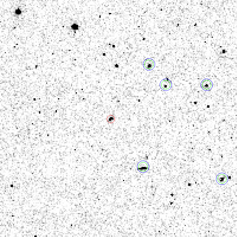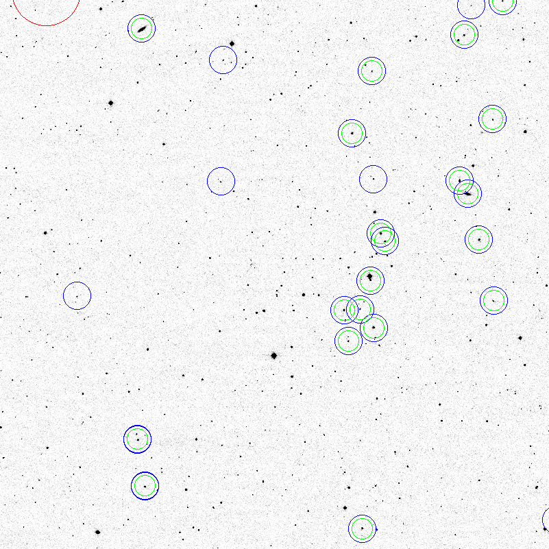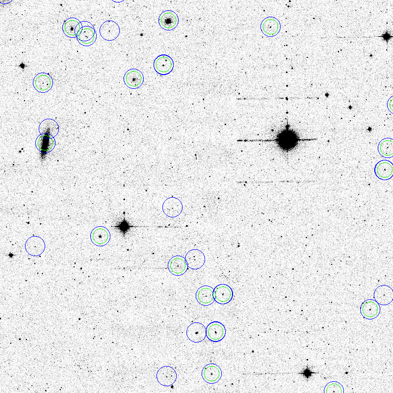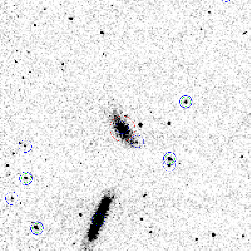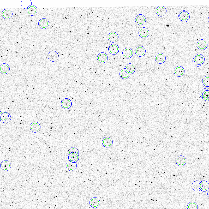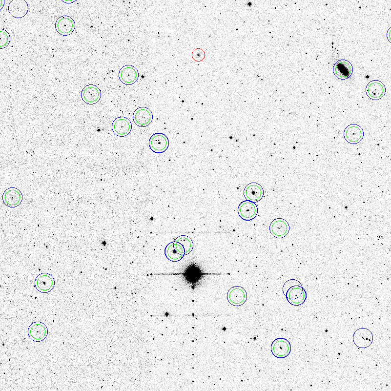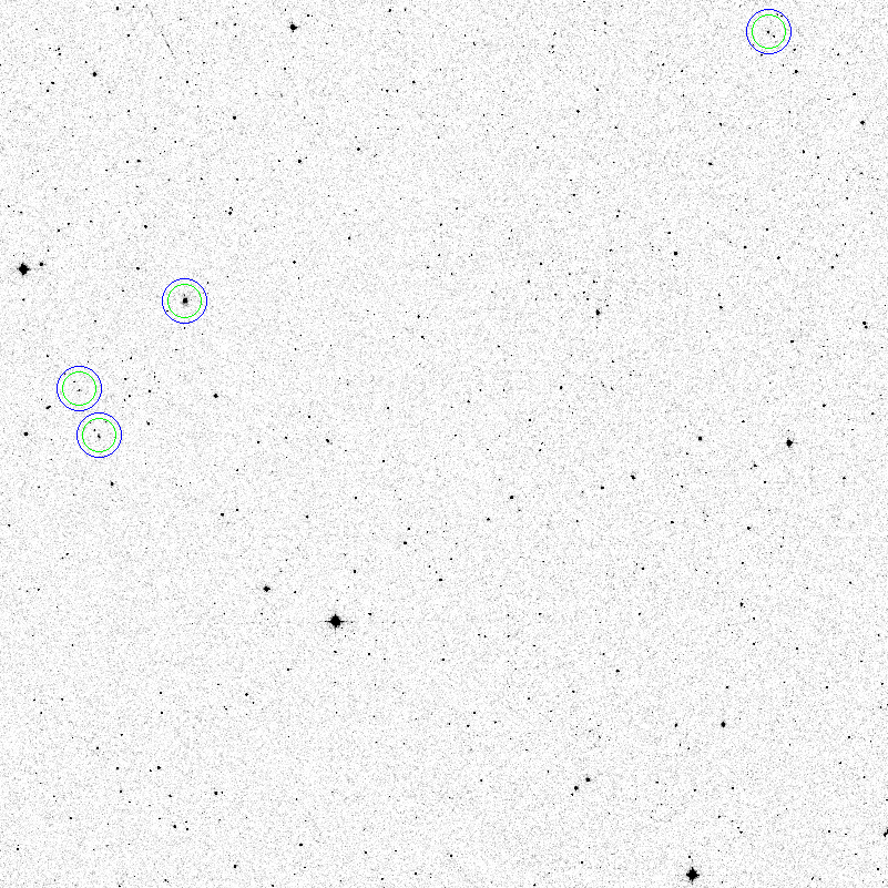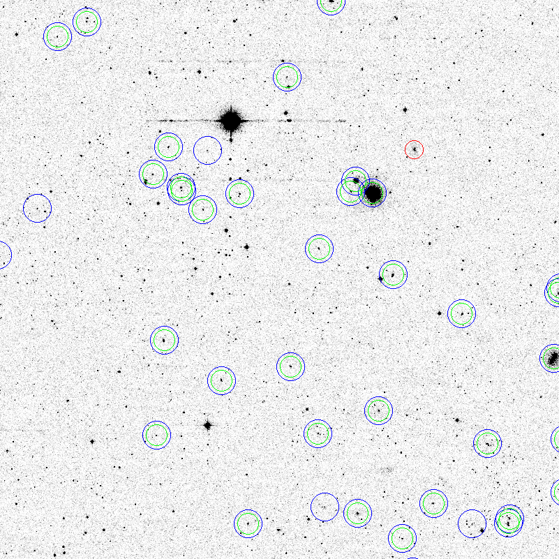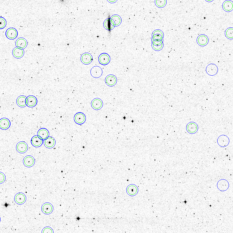 The Virgo mosaic was split into 99 pieces, each 800×800 pixels (approximately 40´ on a side). In Figures 1-99, in Table 1 below, the extended sources from the working database are indicated with blue circles, and the XSC sources are indicated with green circles. The subimages were then visually inspected, concentrating on clearly delineated Virgo galaxies which are not in the XSC (i.e., sources not circled in green). These sources (indicated with red circles) represent incompleteness in the XSC. (Items to note: "chaff" in proximity to large and bright galaxies is mostly eliminated from the XSC; artifacts from bright stars; airglow and background gradients; source confusion; faint or compact sources provide little, if any, information for this experiment.)