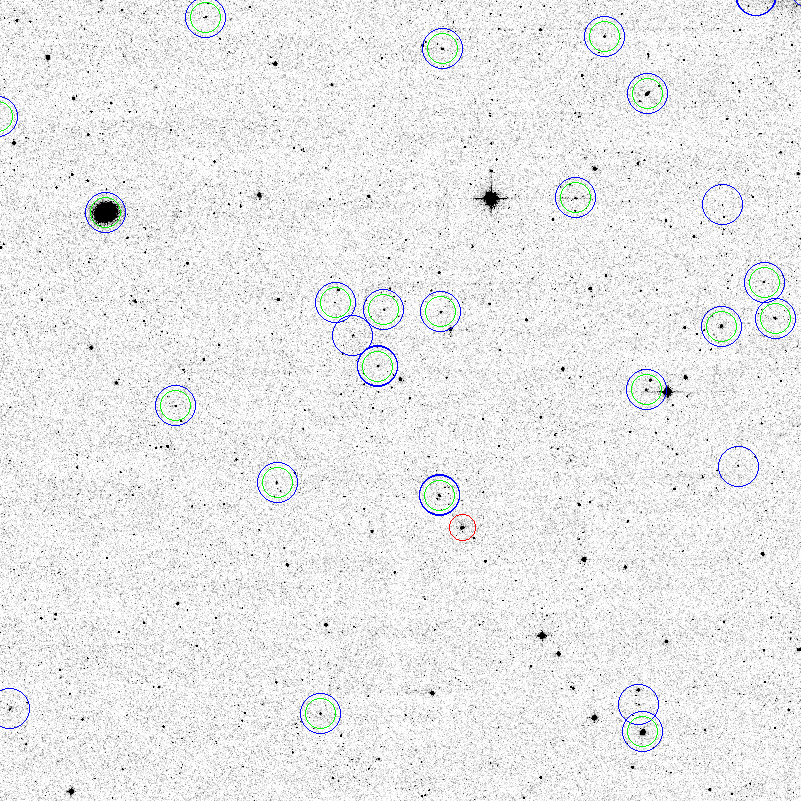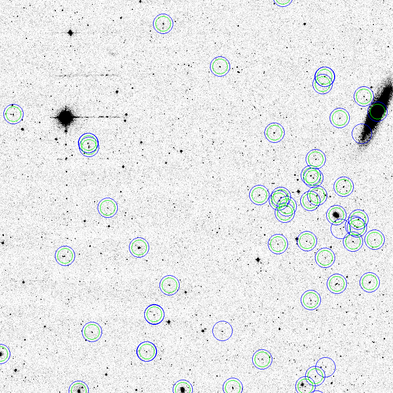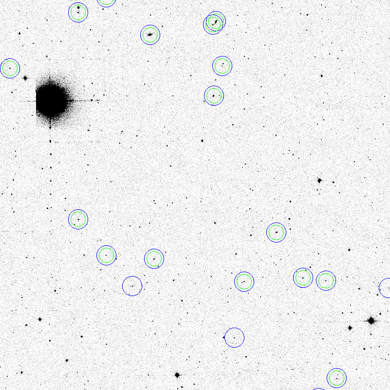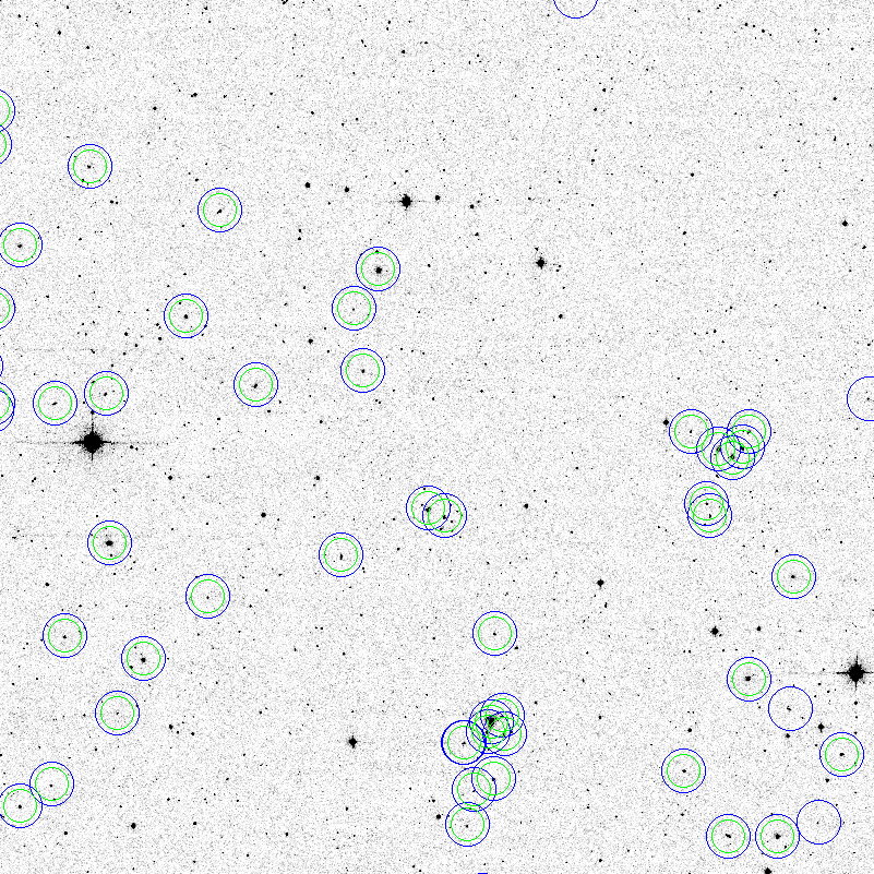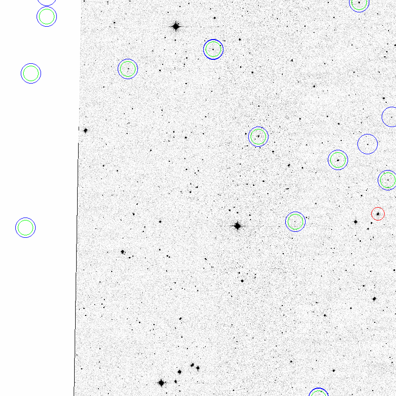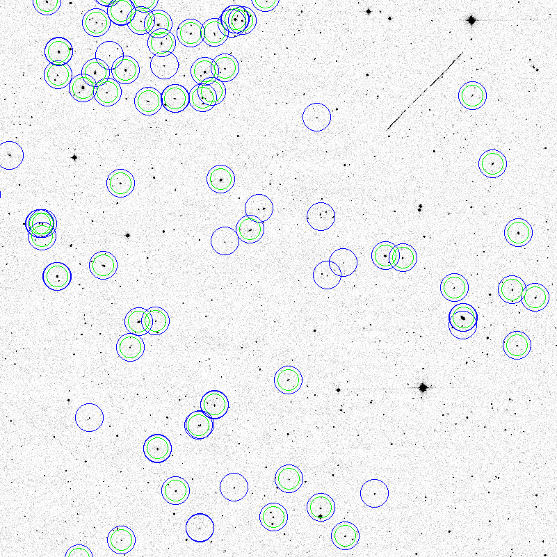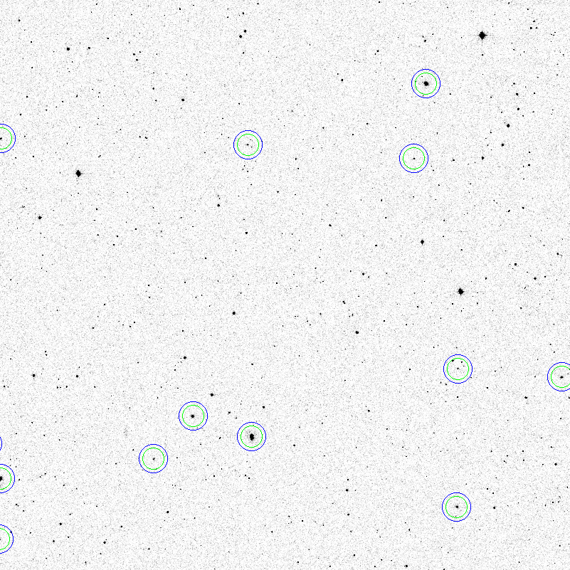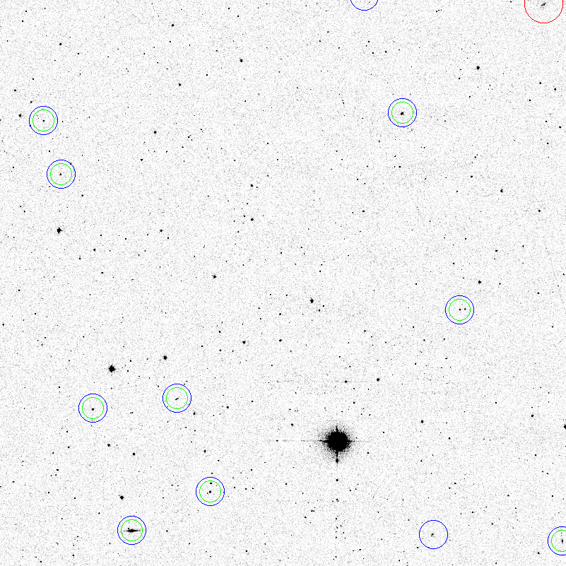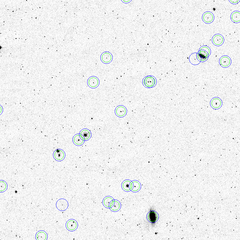 The Virgo mosaic was split into 99 pieces, each 800×800 pixels (approximately 40´ on a side). In Figures 1-99, in Table 1 below, the extended sources from the working database are indicated with blue circles, and the XSC sources are indicated with green circles. The subimages were then visually inspected, concentrating on clearly delineated Virgo galaxies which are not in the XSC (i.e., sources not circled in green). These sources (indicated with red circles) represent incompleteness in the XSC. (Items to note: "chaff" in proximity to large and bright galaxies is mostly eliminated from the XSC; artifacts from bright stars; airglow and background gradients; source confusion; faint or compact sources provide little, if any, information for this experiment.)