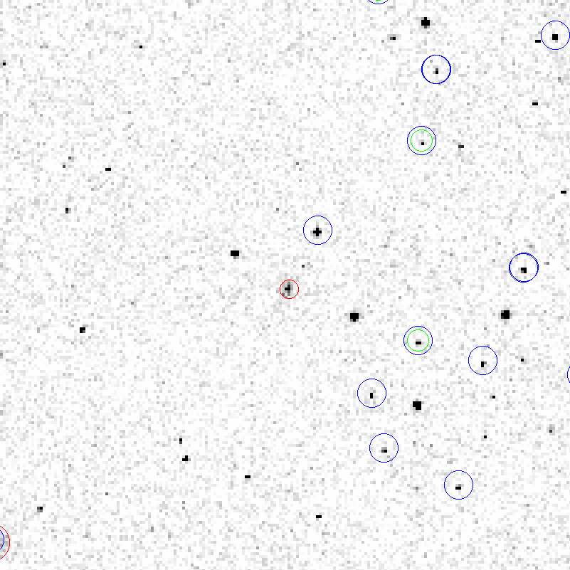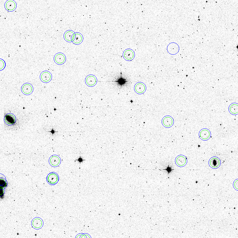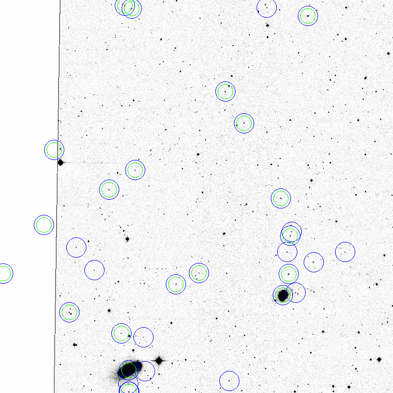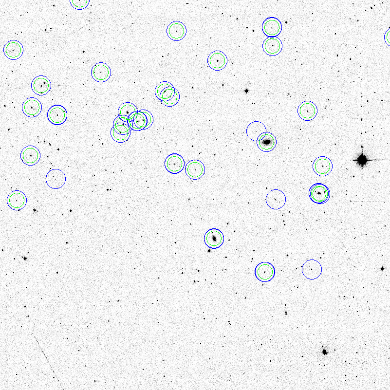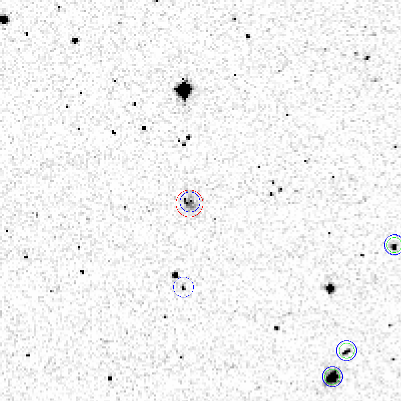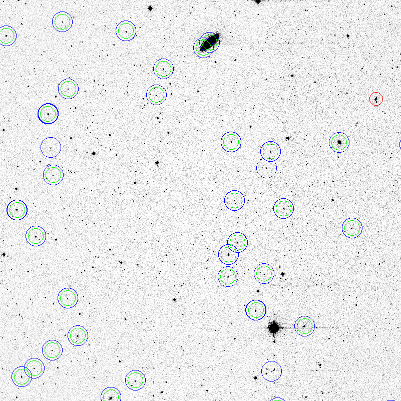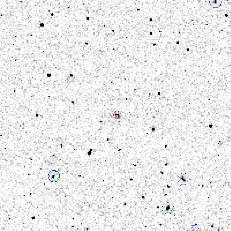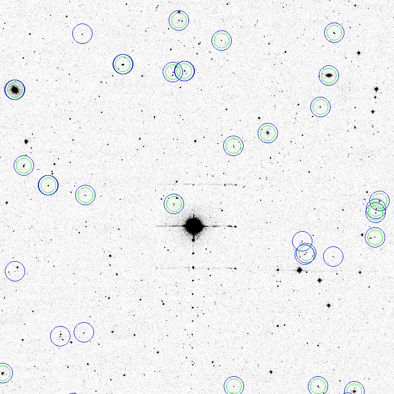 The Virgo mosaic was split into 99 pieces, each 800×800 pixels (approximately 40´ on a side). In Figures 1-99, in Table 1 below, the extended sources from the working database are indicated with blue circles, and the XSC sources are indicated with green circles. The subimages were then visually inspected, concentrating on clearly delineated Virgo galaxies which are not in the XSC (i.e., sources not circled in green). These sources (indicated with red circles) represent incompleteness in the XSC. (Items to note: "chaff" in proximity to large and bright galaxies is mostly eliminated from the XSC; artifacts from bright stars; airglow and background gradients; source confusion; faint or compact sources provide little, if any, information for this experiment.)