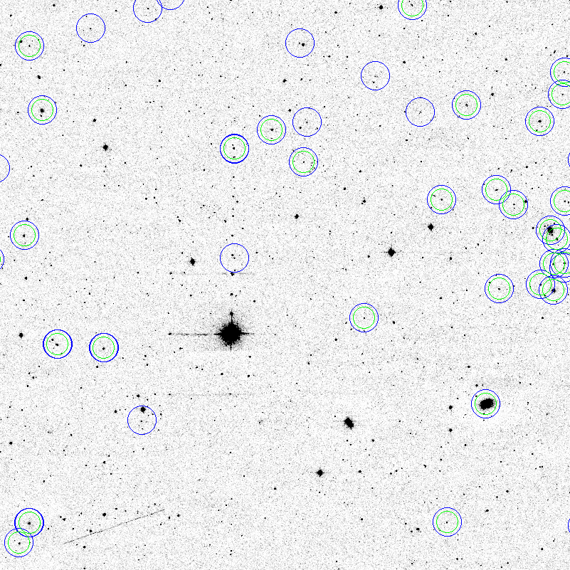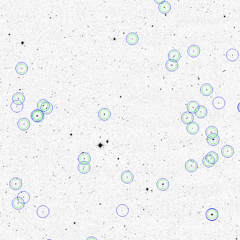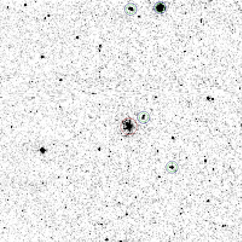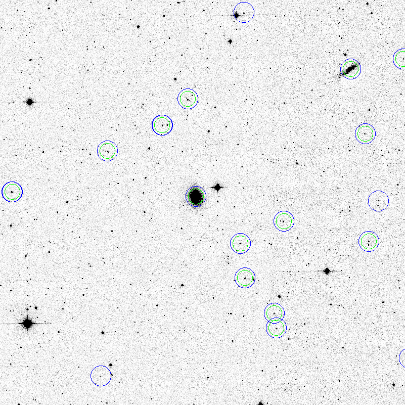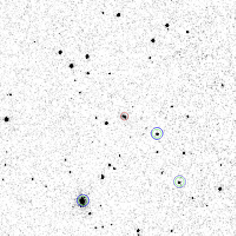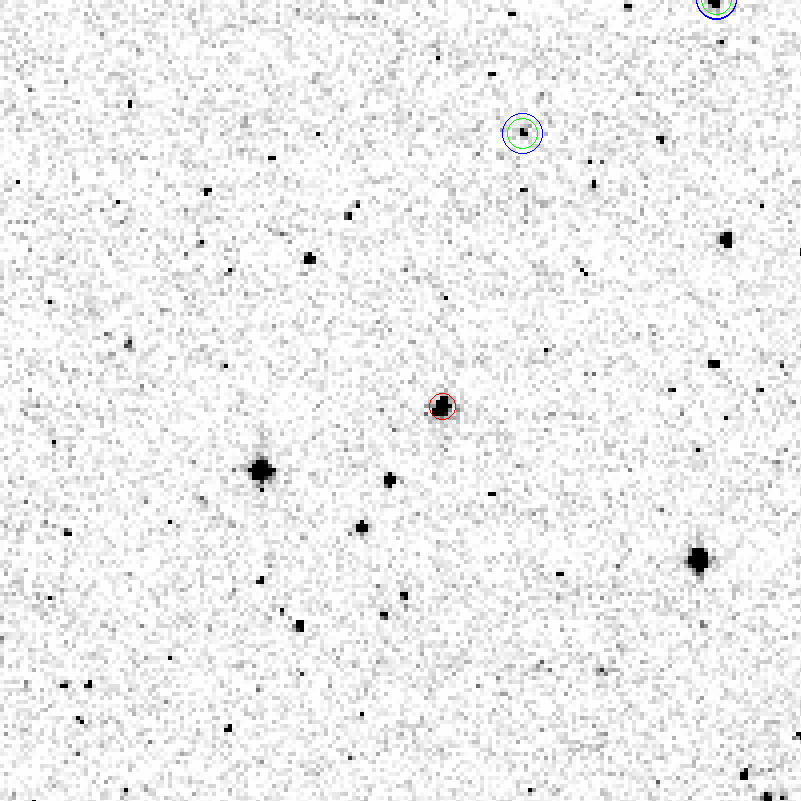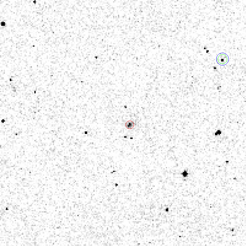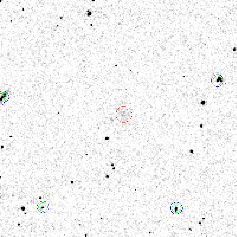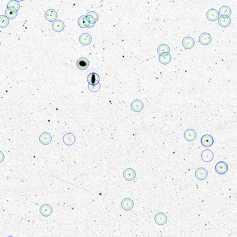 The Virgo mosaic was split into 99 pieces, each 800×800 pixels (approximately 40´ on a side). In Figures 1-99, in Table 1 below, the extended sources from the working database are indicated with blue circles, and the XSC sources are indicated with green circles. The subimages were then visually inspected, concentrating on clearly delineated Virgo galaxies which are not in the XSC (i.e., sources not circled in green). These sources (indicated with red circles) represent incompleteness in the XSC. (Items to note: "chaff" in proximity to large and bright galaxies is mostly eliminated from the XSC; artifacts from bright stars; airglow and background gradients; source confusion; faint or compact sources provide little, if any, information for this experiment.)
