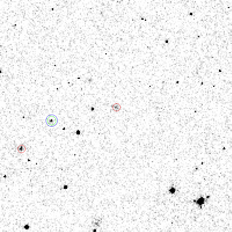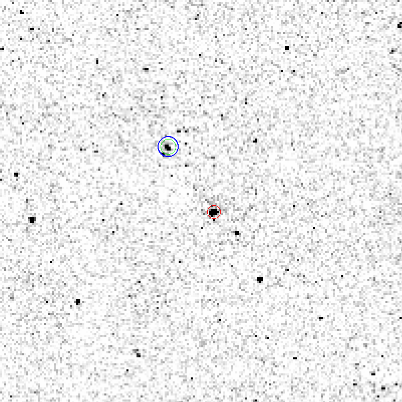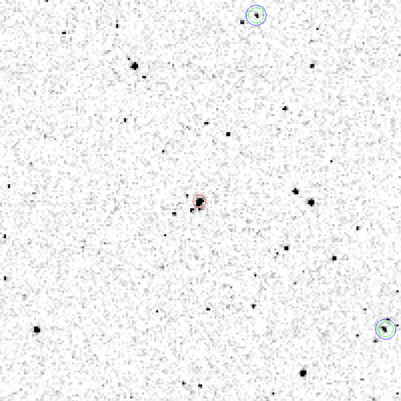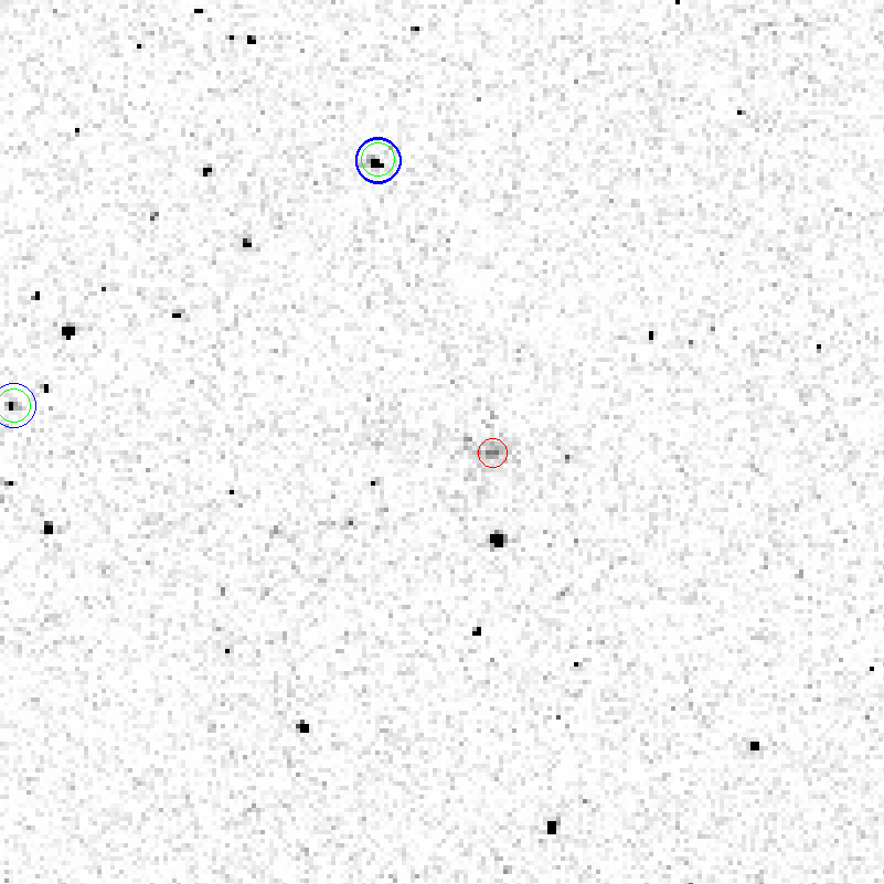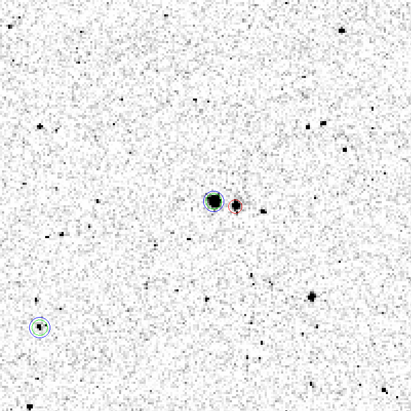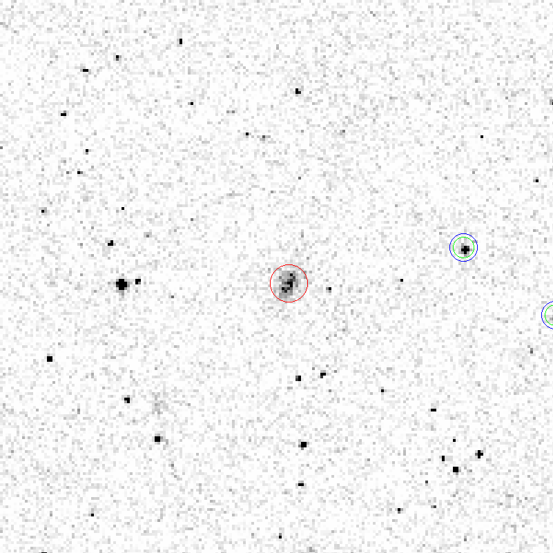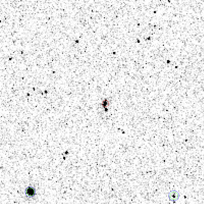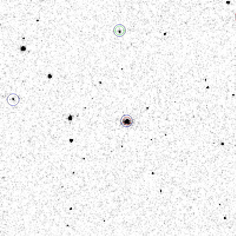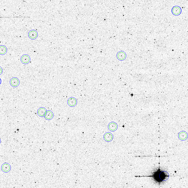 The Virgo mosaic was split into 99 pieces, each 800×800 pixels (approximately 40´ on a side). In Figures 1-99, in Table 1 below, the extended sources from the working database are indicated with blue circles, and the XSC sources are indicated with green circles. The subimages were then visually inspected, concentrating on clearly delineated Virgo galaxies which are not in the XSC (i.e., sources not circled in green). These sources (indicated with red circles) represent incompleteness in the XSC. (Items to note: "chaff" in proximity to large and bright galaxies is mostly eliminated from the XSC; artifacts from bright stars; airglow and background gradients; source confusion; faint or compact sources provide little, if any, information for this experiment.)