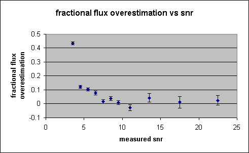 Another way to look at the flux overestimation is to compute the mean flux overestimation, as a fraction of the quoted error, shown in Figure 5. The mean flux overestimation is a full 50% of the quoted flux error for SNR = 6--7, making the quoted flux errors a seriously deficient measure of the true flux accuracy.