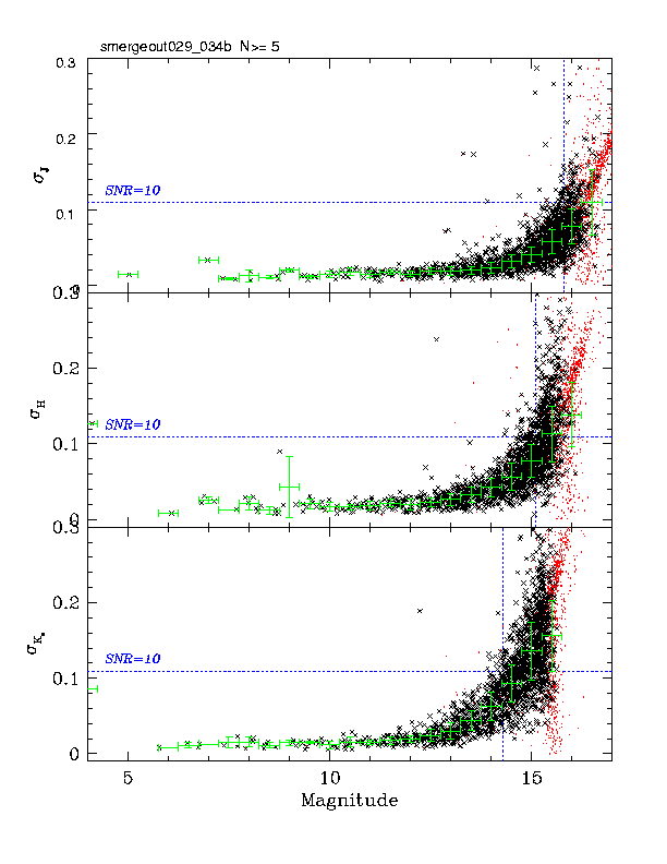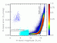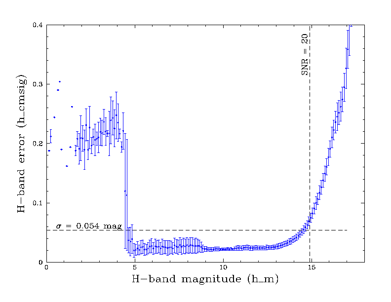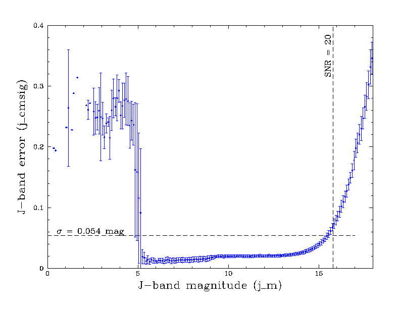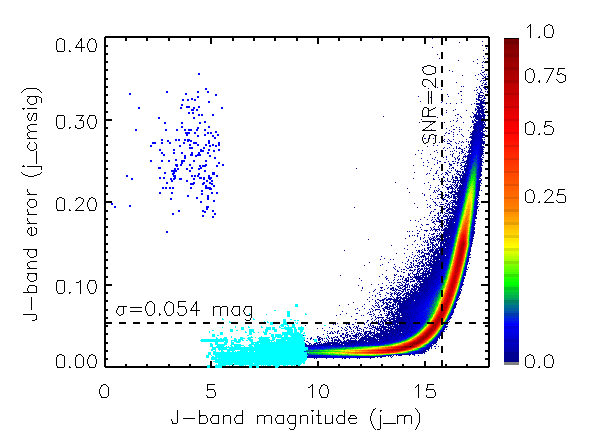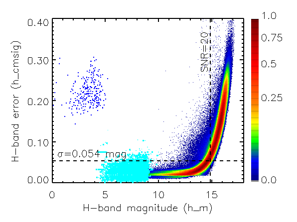 Figures 2--7 show [jhk]_cmsig as a function of magnitude for a representative region of the Point Source Catalog. The 1.9 million points shown are unconfused point sources lying within 15° of the North and South Galactic Poles. In Figures 2, 3, and 4, photometry (via profile fits) of unsaturated rd_flg='2' stars is shown by a multi-color density plot, and photometry (via aperture measures) of unsaturated rd_flg='1' stars is shown by light blue dots. (Extremely bright stars, known as rd_flg='3' sources, are saturated even in the short Read_1 exposures, and are shown by the dark blue points in Figure 2. Although of much lower precision, these "bonus" observations are provided for completeness and are not subject to the Level-1 specifications.) In Figures 5, 6, and 7, blue dots show the trimmed averages of the resulting [jhk]_cmsig values at each 0.1-mag bin. The figures demonstrate that, for rd_flg='1' and rd_flg='2' stars with SNR levels much higher than 20, the photometric precision meets the 5% (0.054 mag) requirement.