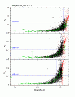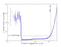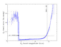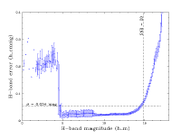 During each hour of survey operations, one of the 2MASS 1° × 8.5´ calibration star regions was scanned six consecutive times to monitor the transparency of the sky. The RMS deviation in the six individual photometric measures for each star also provides a continuous monitor of the photometric precision. Figure 1 shows a six-time repeat of a calibration star region, illustrating the RMS repeatability of each star's photometry (black crosses) as a function of magnitude. The photometric precision is the part of the curve where the repeatability is roughly constant with magnitude. This asymptote is the ultimate limit of our measurement accuracy, which is dominated by pixelization effects.