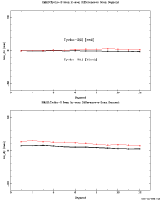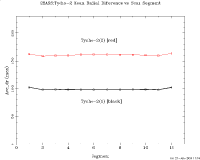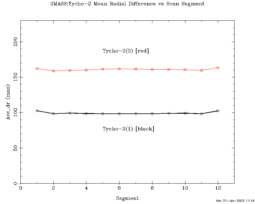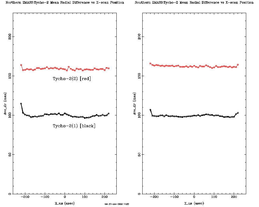 Figure 15 shows mean radial difference as a function of cross-scan position, for the northern hemisphere observations in the left panel and southern hemisphere in the right panel. The Tycho-2(1) differences are relatively constant across most of the scan width, but rise steeply very near the east edge for northern hemisphere data.