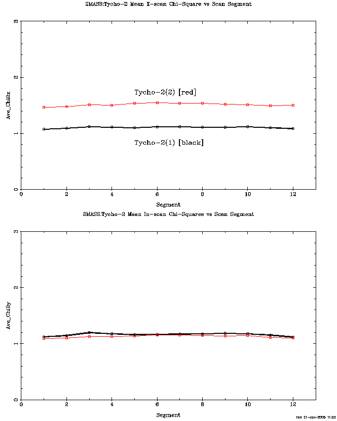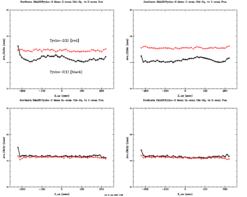 upper panels and in-scan in the lower. Both Tycho-2(1) and Tycho-2(2)