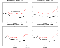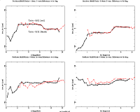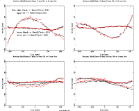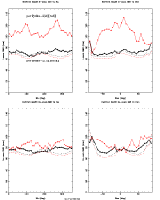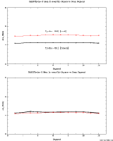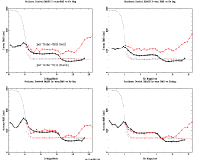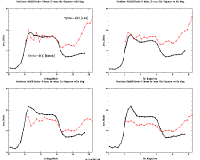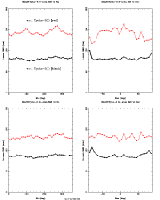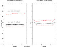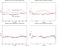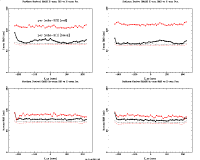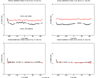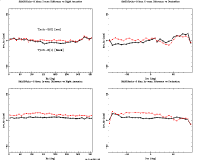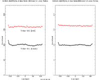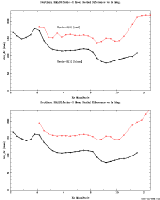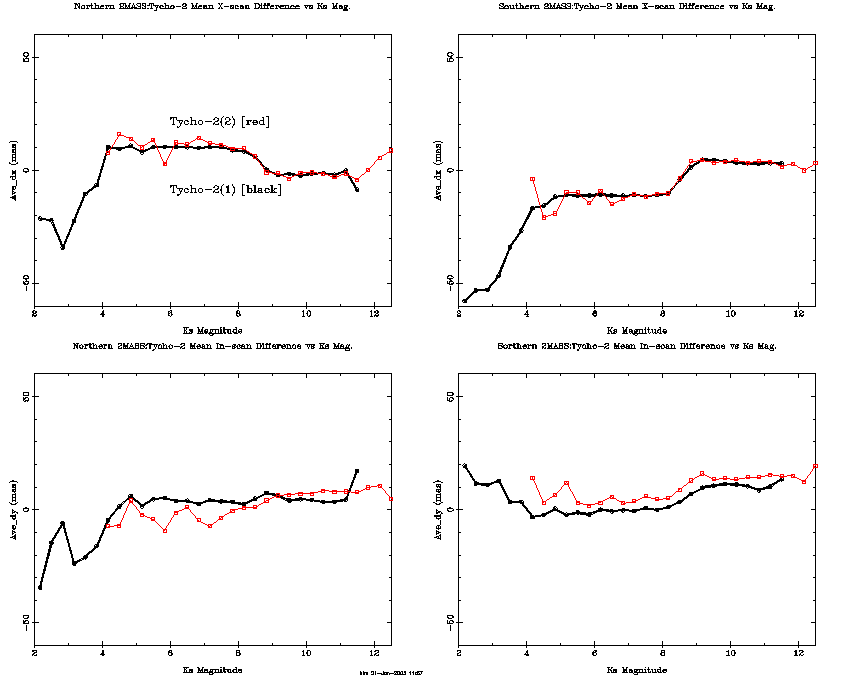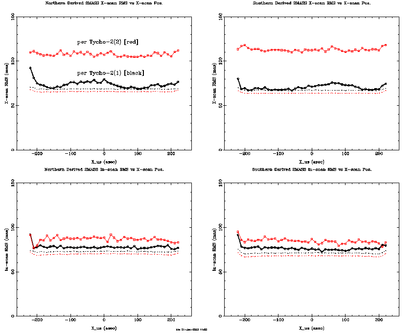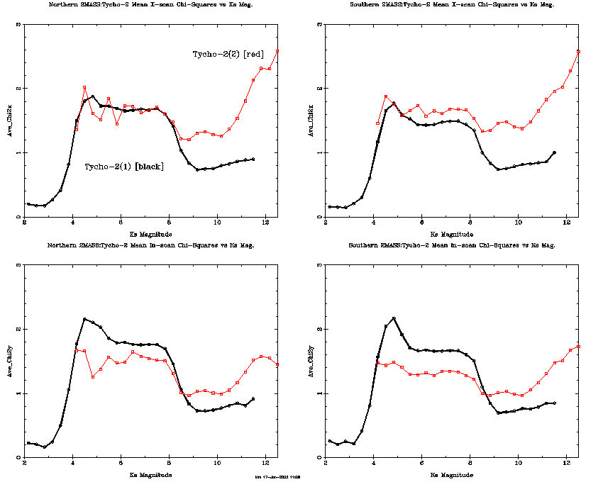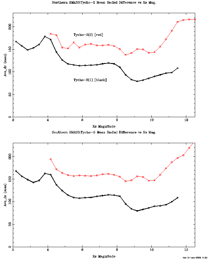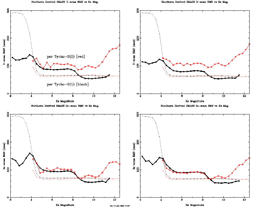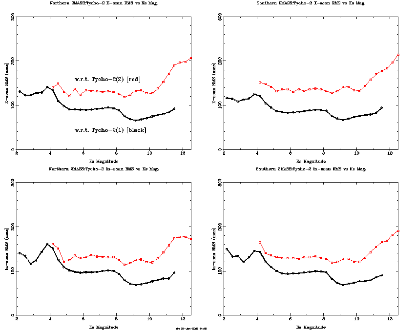 Figure 20 shows mean radial differences as a function of Ks magnitude, with northern data in the upper panel and southern in the lower. The two hemispheres show very similar results. Although the boundaries are fuzzy, one can interpret these curves in terms of the read type and saturation state. Note that there is a plateau between Ks=5 and Ks=8 mag, which roughly corresponds to the unsaturated Read_1 regime. Mean radial differences rise as one moves from the unsaturated Read_1 plateau toward brighter sources. It peaks just to the bright side of Ks=4 mag, which roughly corresponds to Read_1 saturation. Moving from the unsaturated Read_1 plateau toward fainter sources, the mean radial difference values drop to a minimum around Ks=9 mag, where we are fully into the Read_2 regime. From this point there is a more gradual increase in mean radial difference with increasing magnitude. Tycho-2(2) differences show a faster rise than Tycho-2(1). The RMS of the 2MASS vs. Tycho-2 differences for Tycho-2(1) (black) and Tycho-2(2) (red) are shown in Figure 21 as a function of Ks magnitude, with northern data in the left panels and southern in the right. Cross-scan results are in the upper panels and in-scan results the lower.
