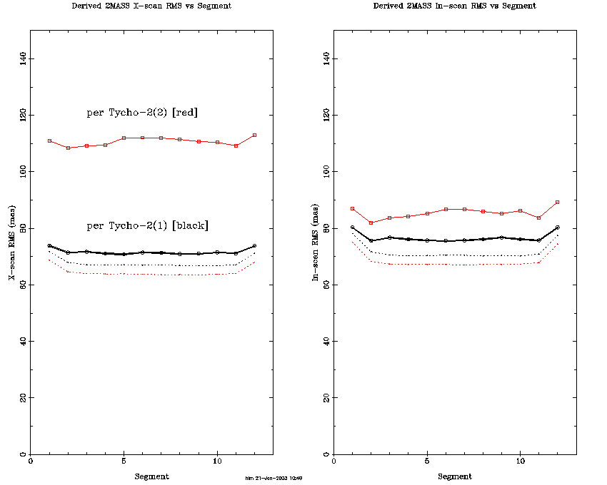 Based on Tycho-2(1) comparisons, the overall 2MASS reconstruction accuracy appears to be in the range of 70-80 mas, both in cross-scan and in-scan. One should bear in mind, however, that 2MASS sources matched to Tycho-2 are relatively bright. Positional accuracy for fainter sources may be reduced. Also, the fact that Tycho-2 was used as the reference catalog means one must be very careful using it as a measure of success. In theory, one could "nail" the Tycho-2 stars and still leave everything in between much worse off. Analysis of 2MASS:UCACr10 differences, as well as 2MASS overlap differences, however, show that this is not occurring.
