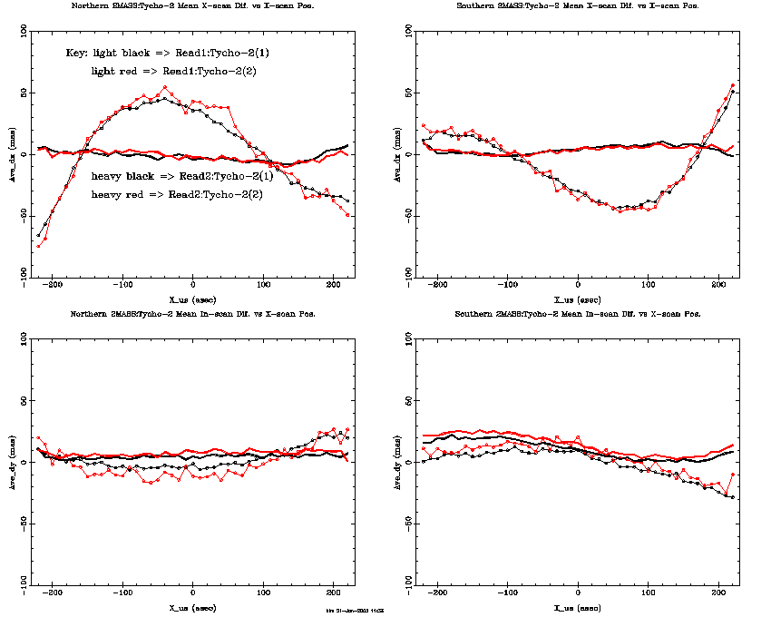 Note that there is little difference between Tycho-2(1) and Tycho-2(2) results. In each case the distortion is well corrected for Read_2-Read_1 sources, but not for Read_1 sources. It was only recently discovered that, due to a coding error, the Read_1 positions were pulled out of PFPrep before the distortion correction was applied. This error remained undiscovered during the QA monitoring, because Read_1 and Read_2-Read_1 sources were lumped together, and Read_1 sources make up a small percentage of the total. As it turns out, Read_1 sources have larger errors anyway, so the distortion is a relatively small contributor.