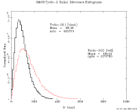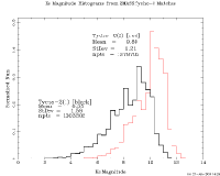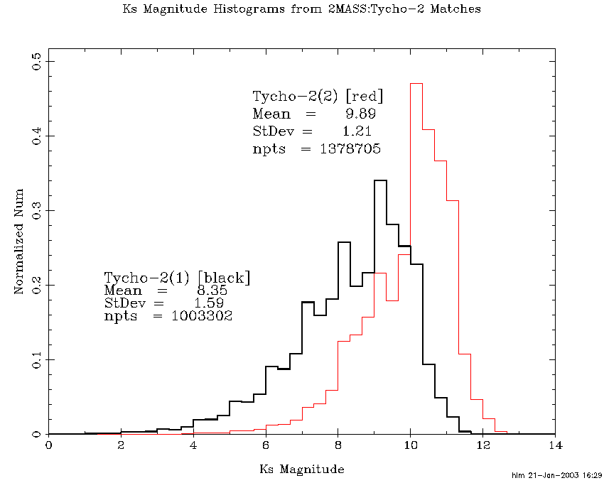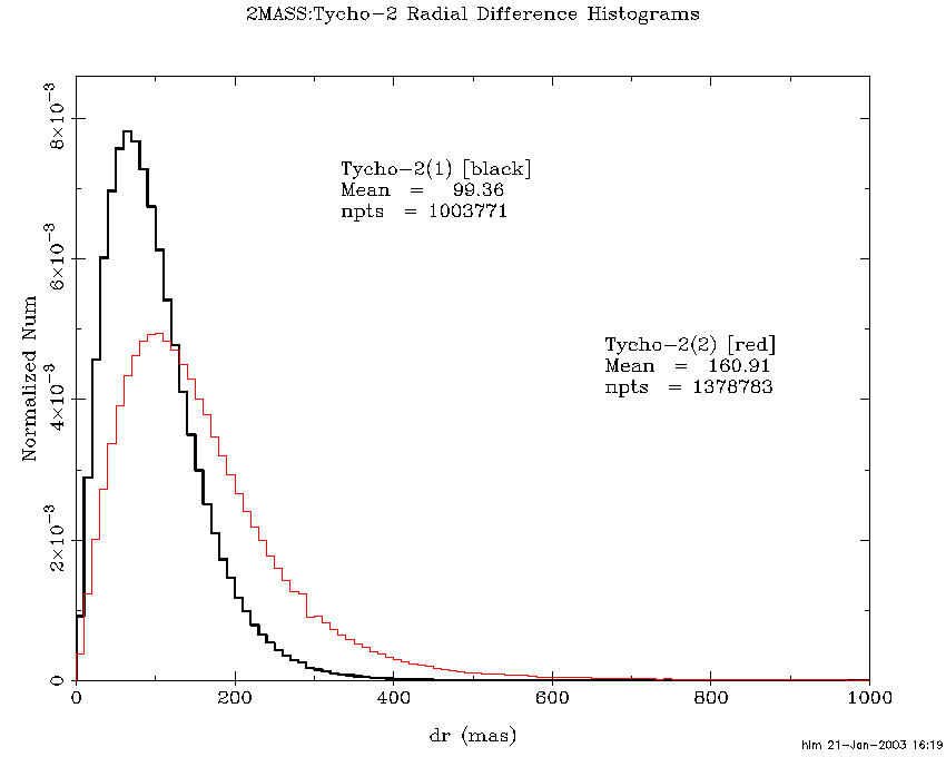 Figure 2 shows normalized histograms of 2MASS vs. Tycho-2 radial differences. As before, the Tycho-2(1) data are plotted using heavy black lines and Tycho-2(2) using light red lines. The mean radial difference for Tycho-2(1) is 99 mas, and for Tycho-2(2) is 161 mas.