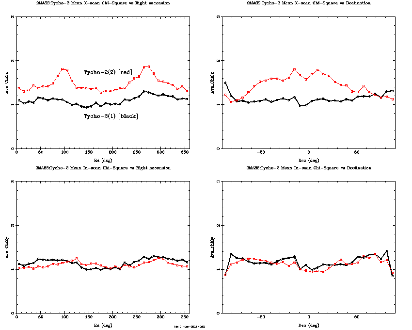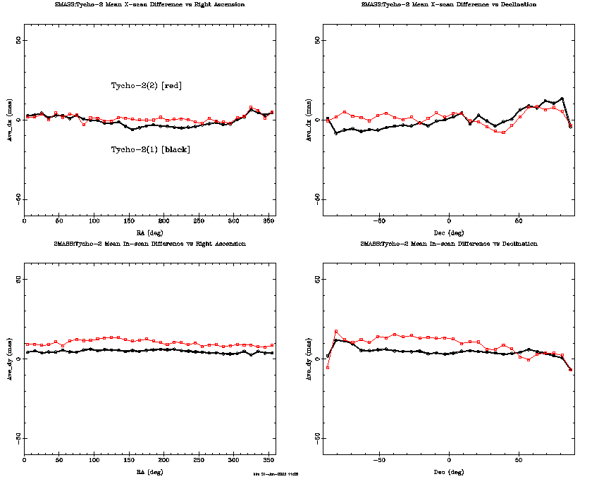 Figure 5 shows mean cross-scan (upper panels) and in-scan (lower panels) position differences with respect to both Tycho-2(1) and Tycho-2(2) as a function of RA (left panels) and Dec (right panels). Although small deviations are present, there do not appear to be any large systematic errors as a function of sky position.
