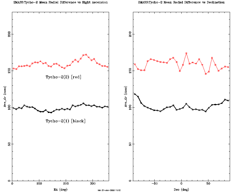 Mean radial differences for both Tycho-2(1) and Tycho-2(2) matches are plotted as a function of RA (left panel) and Dec (right panel) in Figure 6. Note that from the Tycho-2(1) values there is a gradual increase approaching the south pole from values less than 100 mas to almost 120 mas. The increase can also be seen approaching the north pole, but it is only about half as large. Interestingly, these effects are not obvious in the Tycho-2(2) data.