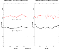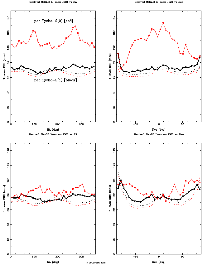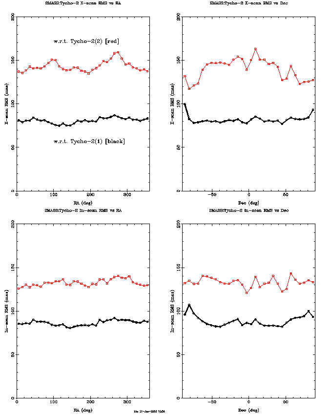 The RMS of the 2MASS vs. Tycho-2 differences are shown in Figure 7 as a function of RA (left panels) and Dec (right panels), with cross-scan in the upper panels and in-scan in the lower panels. In addition to being much larger the 2MASS vs. Tycho-2(2) RMS values show systematic changes with sky position not seen with 2MASS vs. Tycho-2(1).
