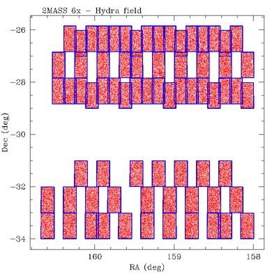 The scan coverage of this field is split into two 3° long declination bands separated by 2° as a result of the telescope commanding error that affected the 1° long 6x scans. The north and south sections of the Hydra field coverage are comprised of three partially filled declination rows of scans. There are a number of gaps throughout each of the sections. See Figure 1.