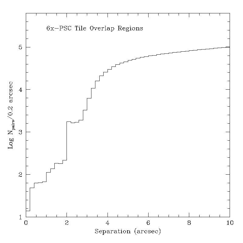 There are approximately 1000 cases in the 6x-PSC where the multiple detections in tile overlap regions were not properly handled and two detections of the same source from different scans were promoted to the Catalog. A histogram of radial separations between pairs of 6x-PSC sources in scan overlap regions is shown in Figure 13. The roll-off in number of pairs with separations less than 5-6" is a result of the effective resolution limit of the 2MASS telescope and camera system. The sharp drop below 2" separation is caused by the 2" match window used in the 6x-PSC multiple detection resolution process, and the the pairs with separations <2" are those that were not properly dealt with by the multiple detection resolution process. A similar population of small separation source pairs exists in the All-Sky PSC, as seen in Figure 14 in I.6.b.ix.
