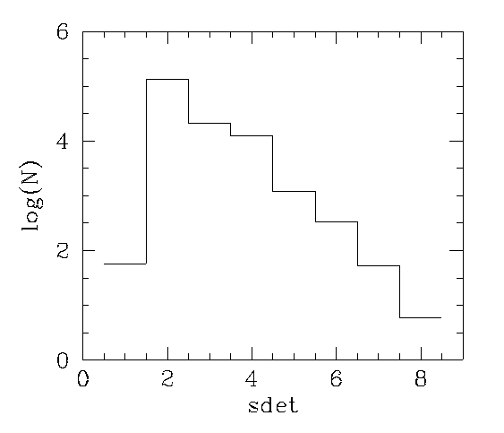 | Figure 3 - Distribution of Survey Merged Point Source WDB sources in RA and Dec. The diameter of the circle is 20° and the circle is centered at the North Galactic Pole. Evident are the tile overlap regions (narrow vertical strips), declination overlap between declination bands (horizontal lines) and re-scanned tiles (larger patches). | Figure 4 - Histogram of the number of sources as a function of sdet (number of apparitions being averaged to form the mean fluxes). | |