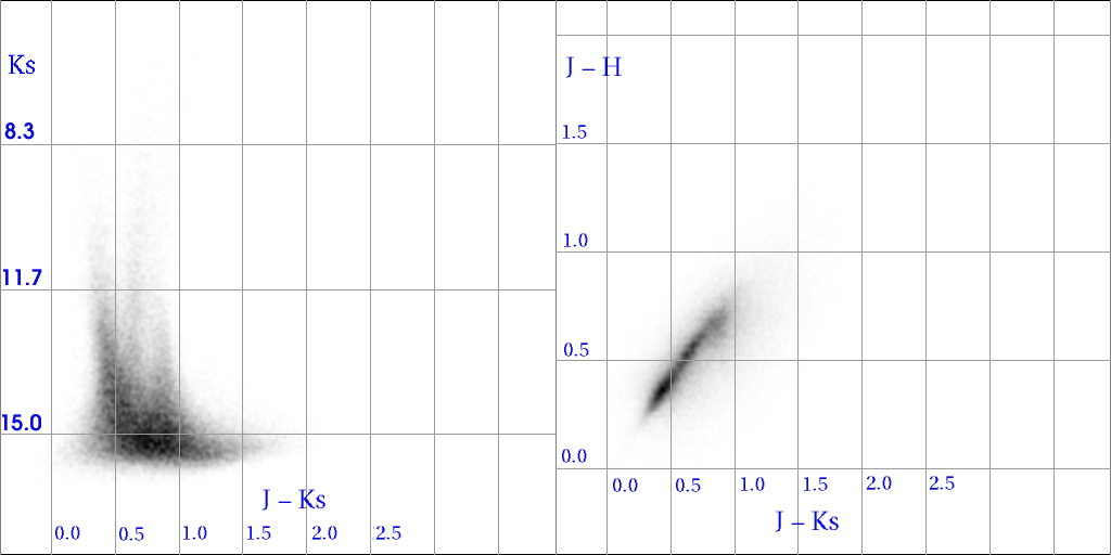 The Hess diagrams below compare the contents of the All-Sky PSC (left) and Survey Merged PSWDB (right) for a 20° diameter field (b>80°) at the North Galactic Pole pole. Only sources of high reliability are included (ph_qual!~'[EFUX]') for the PSC and rel_avg='A' for the Merged PSWDB).
