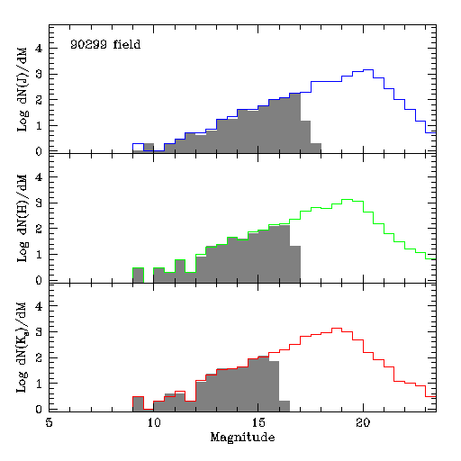 | Figure 1 - Differential counts vs. magnitude for J (top), H (center), and Ks (bottom) bands. 2MASS All-Sky PSC source counts in the same approximate area are shown in the shaded region. | Figure 2 - Photometric uncertainties plotted versus magnitude for J (top), H (center), and Ks (bottom) bands. | Figure 3 - Log 1-sigma noise (mJy) histograms for J (top), H (center), and Ks (bottom) bands. |