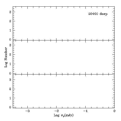 | Figure 1 - Differential counts vs. magnitude for J (top), H (center), and Ks (bottom) bands. 2MASS All-Sky PSC source counts in the same approximate area are shown in the shaded region. | Figure 2 - Photometric uncertainties plotted versus magnitude for J (top), H (center), and Ks (bottom) bands. | Figure 3 - Log 1-sigma noise (mJy) histograms for J (top), H (center), and Ks (bottom) bands. |