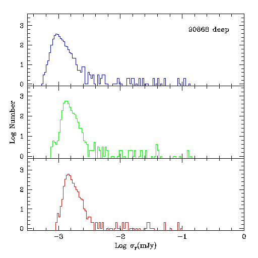 | Figure 1 - Differential counts vs. magnitude for J (top), H (center), and Ks (bottom) bands. 2MASS All-Sky PSC source counts in the same approximate area are shown in the shaded region. | Figure 2 - Photometric uncertainties plotted versus magnitude for J (top), H (center), and Ks (bottom) bands. | Figure 3 - Log 1-sigma noise (mJy) histograms for J (top), H (center), and Ks (bottom) bands. |